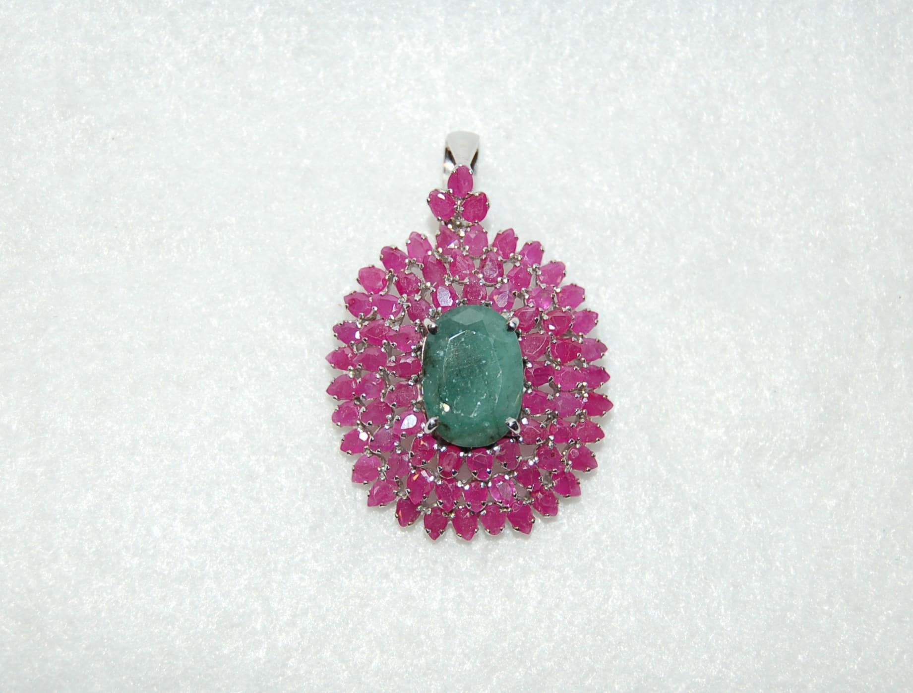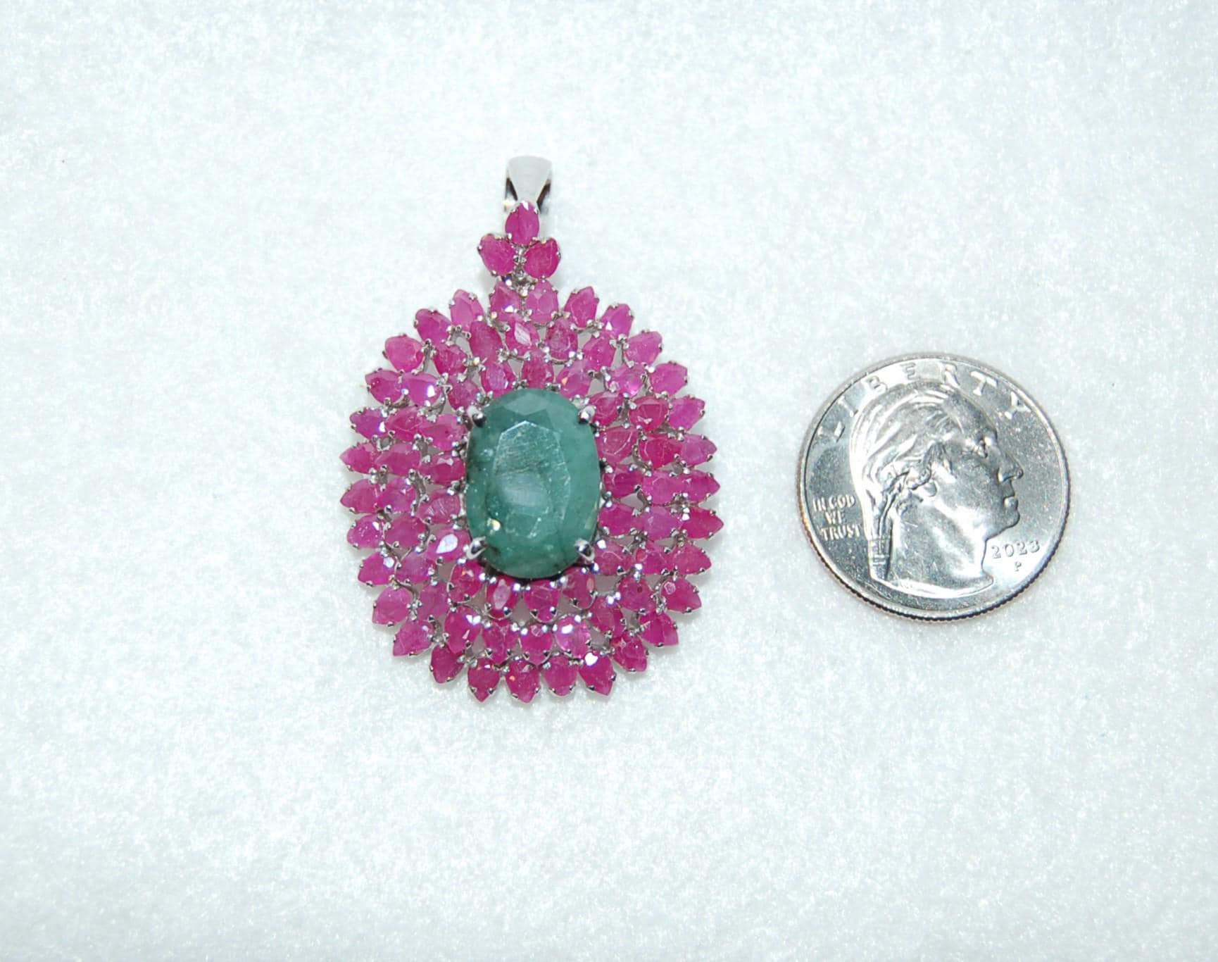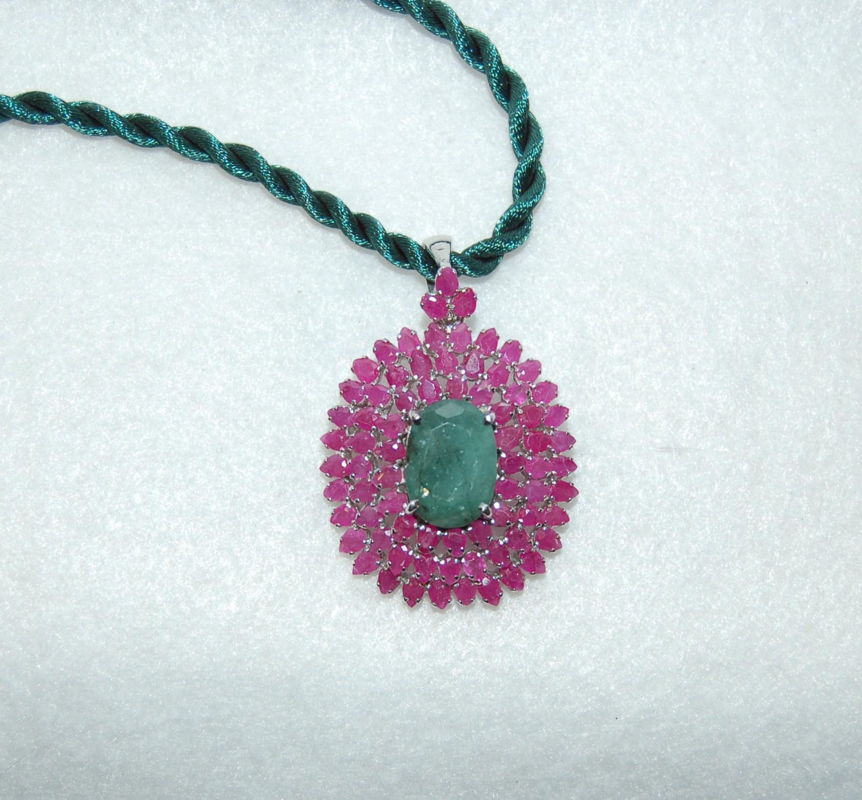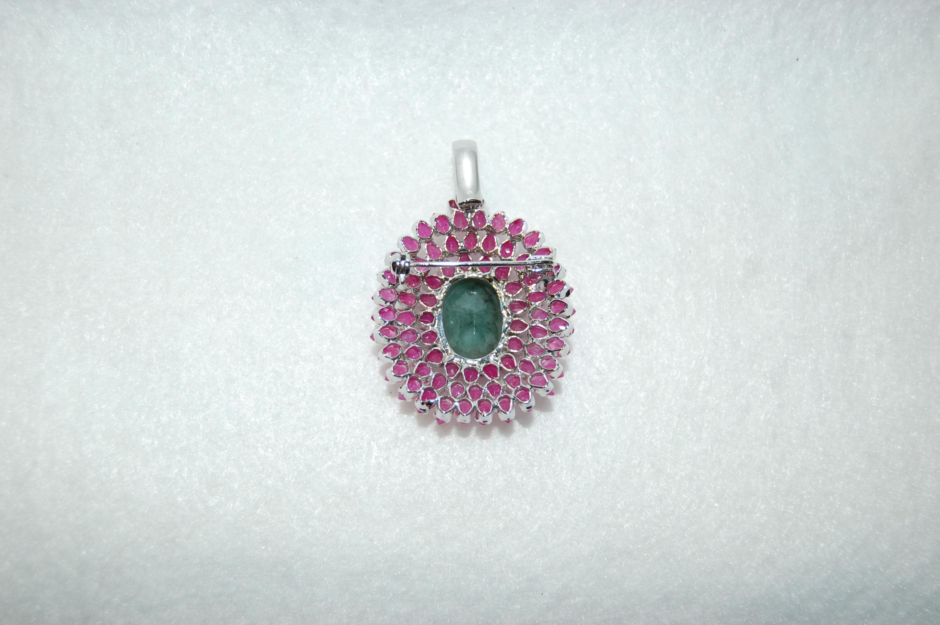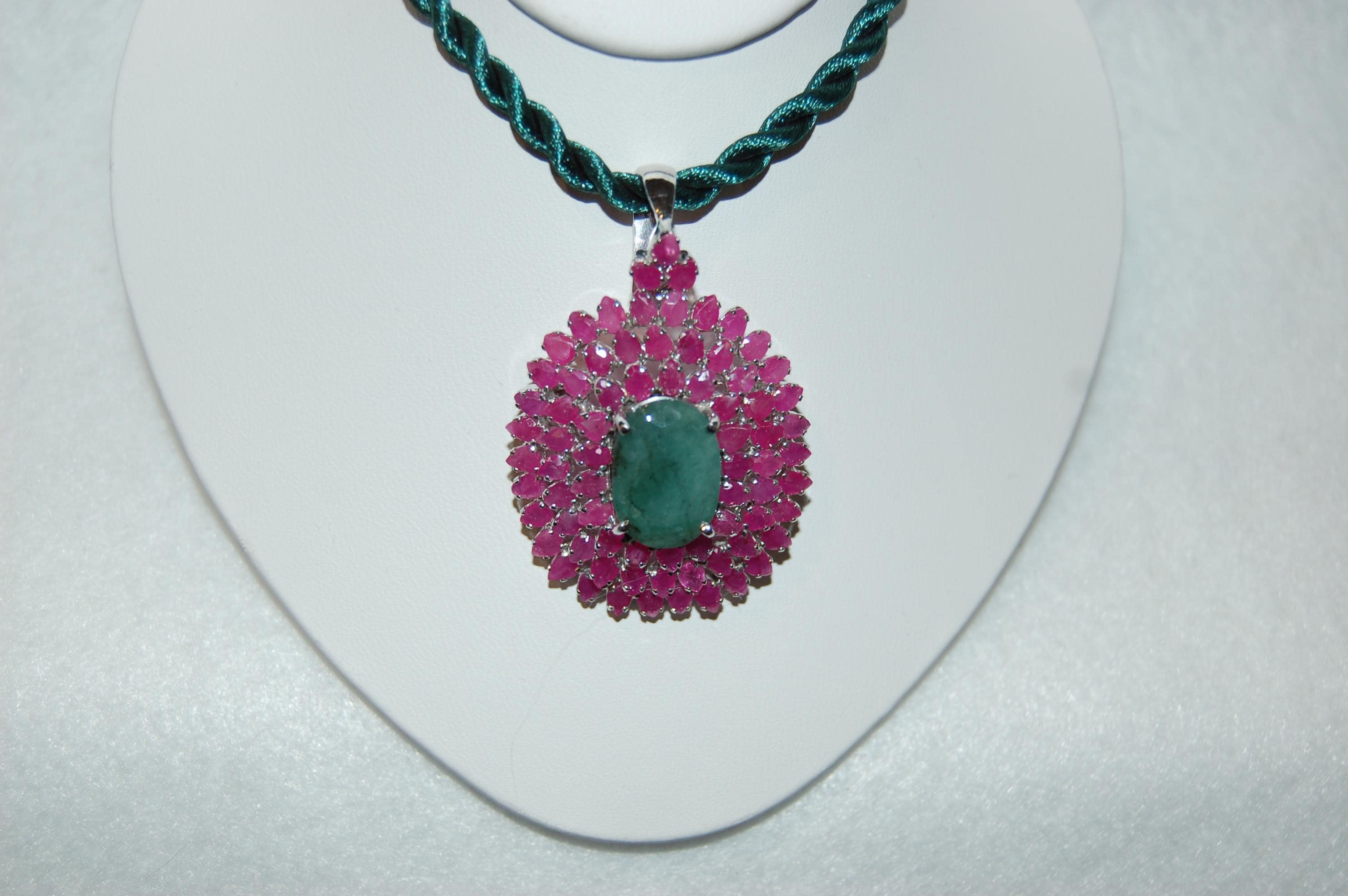 Simply spectacular and versatile! The pendant features a large central faceted emerald, surrounded by numerous smaller pink rubies in a sunburst pattern. The stones are set in silver highlighting the vivid colors of the gems. We pared pendant with a green twisted cord necklace, which adds a contrasting texture and color to the overall design. Don't want to wear it as pendant, wear it as a pin. This pendant turns into a pin at the drop of a hat. A special piece that's a must have! 36ct total emerald and rubies, sterling silver, 2" long, 1.25" wide, 16" long cord