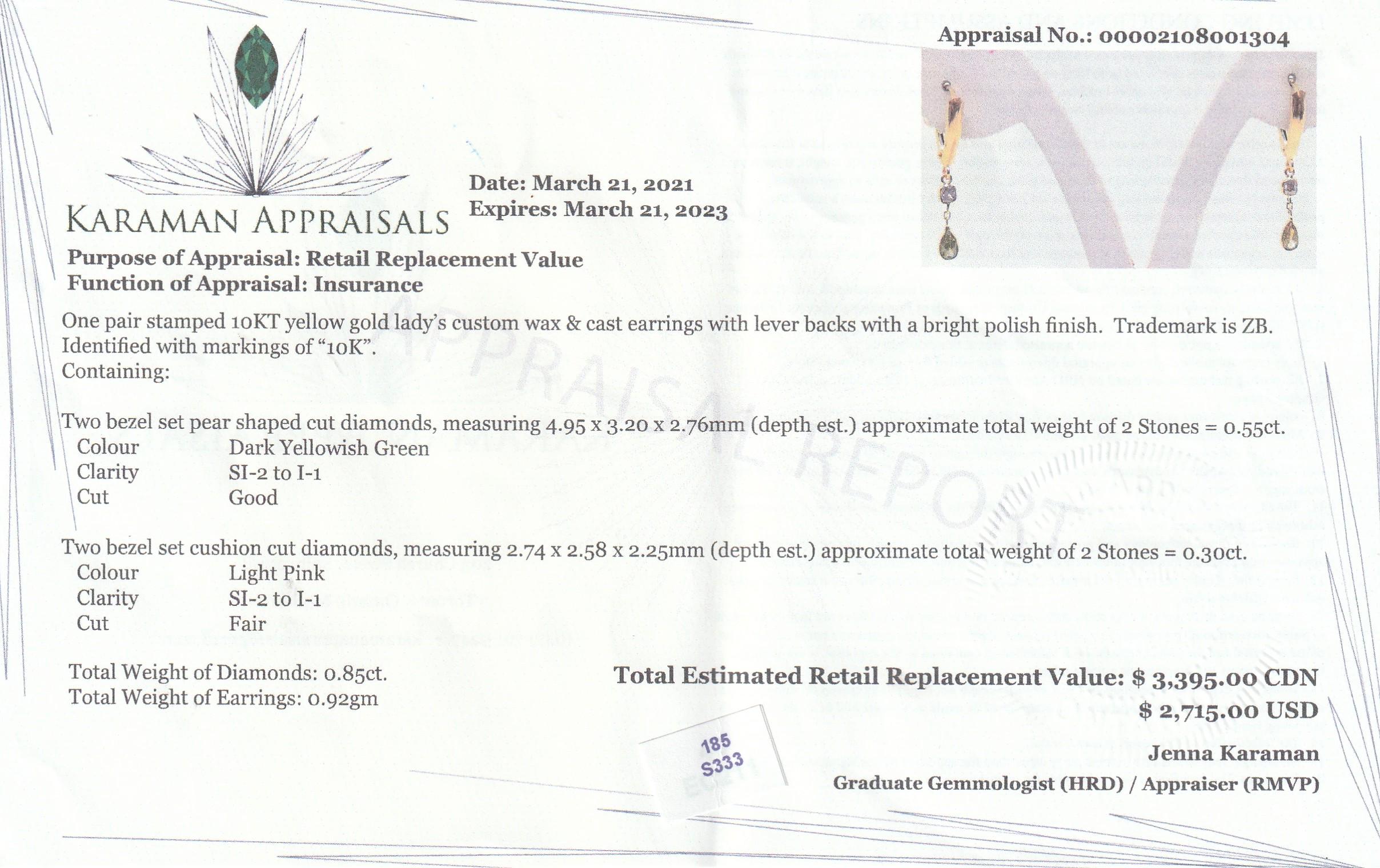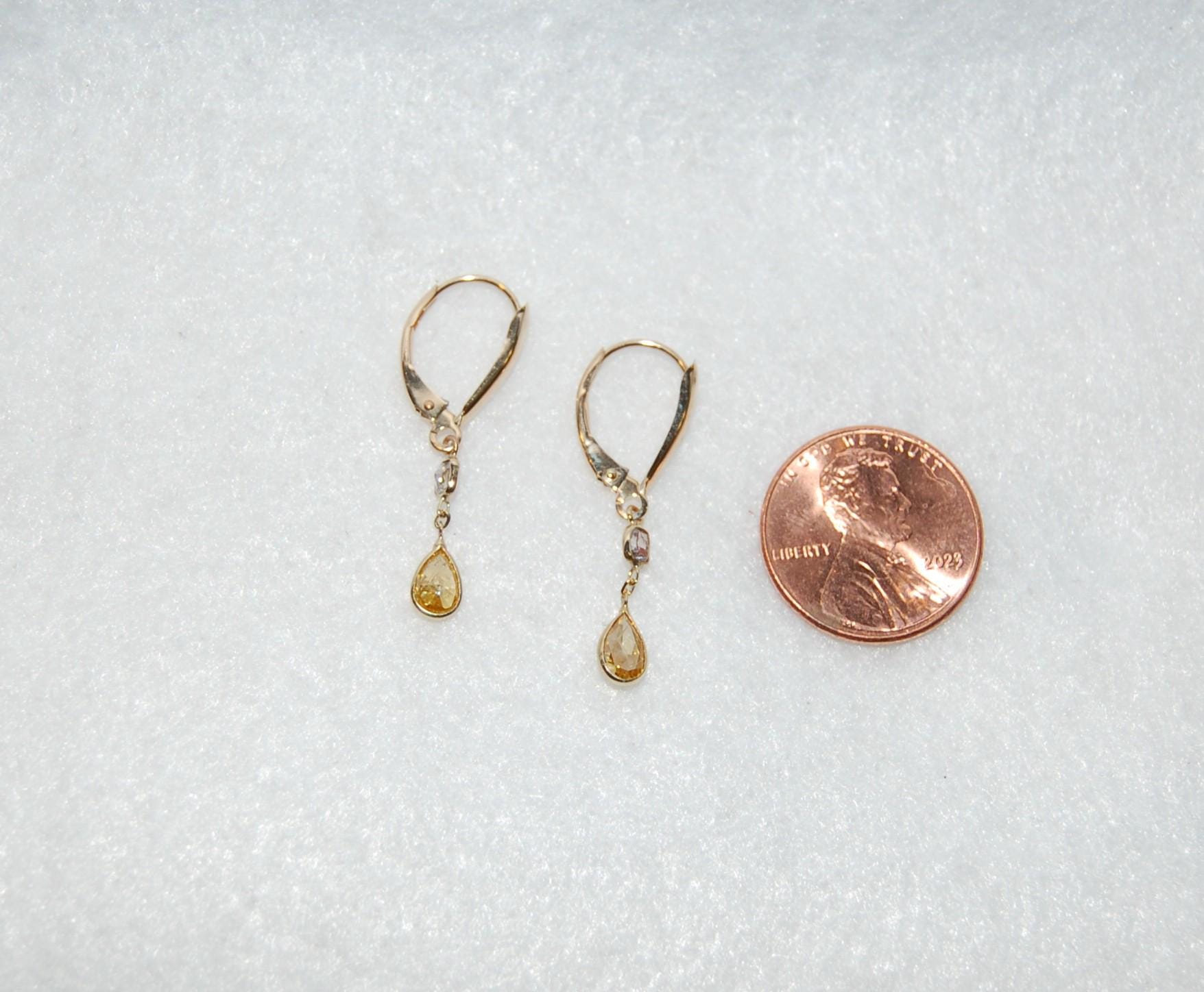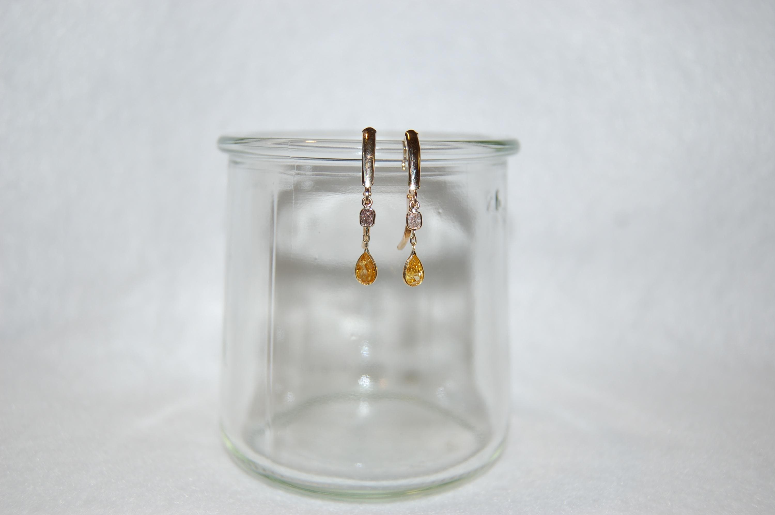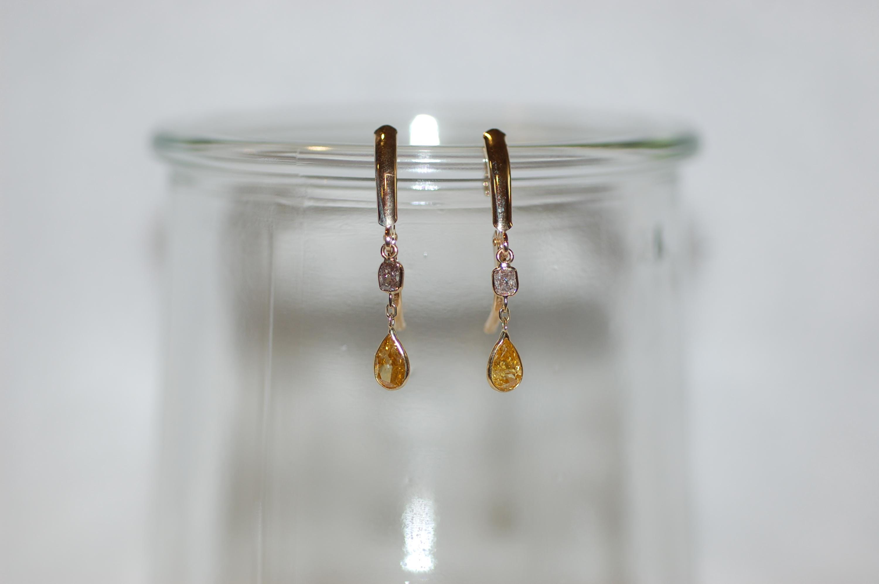 Simply gorgeous! Two light pink cushion cut diamonds and two dark yellow pear shape diamonds are bezel set in warm 14K yellow gold. The gold lever back earrings create the perfect drop for the stones. The overall design is delicate and refined, with a luxurious yet understated appearance. .85cttw diamonds, 14K yellow gold, .5" drop