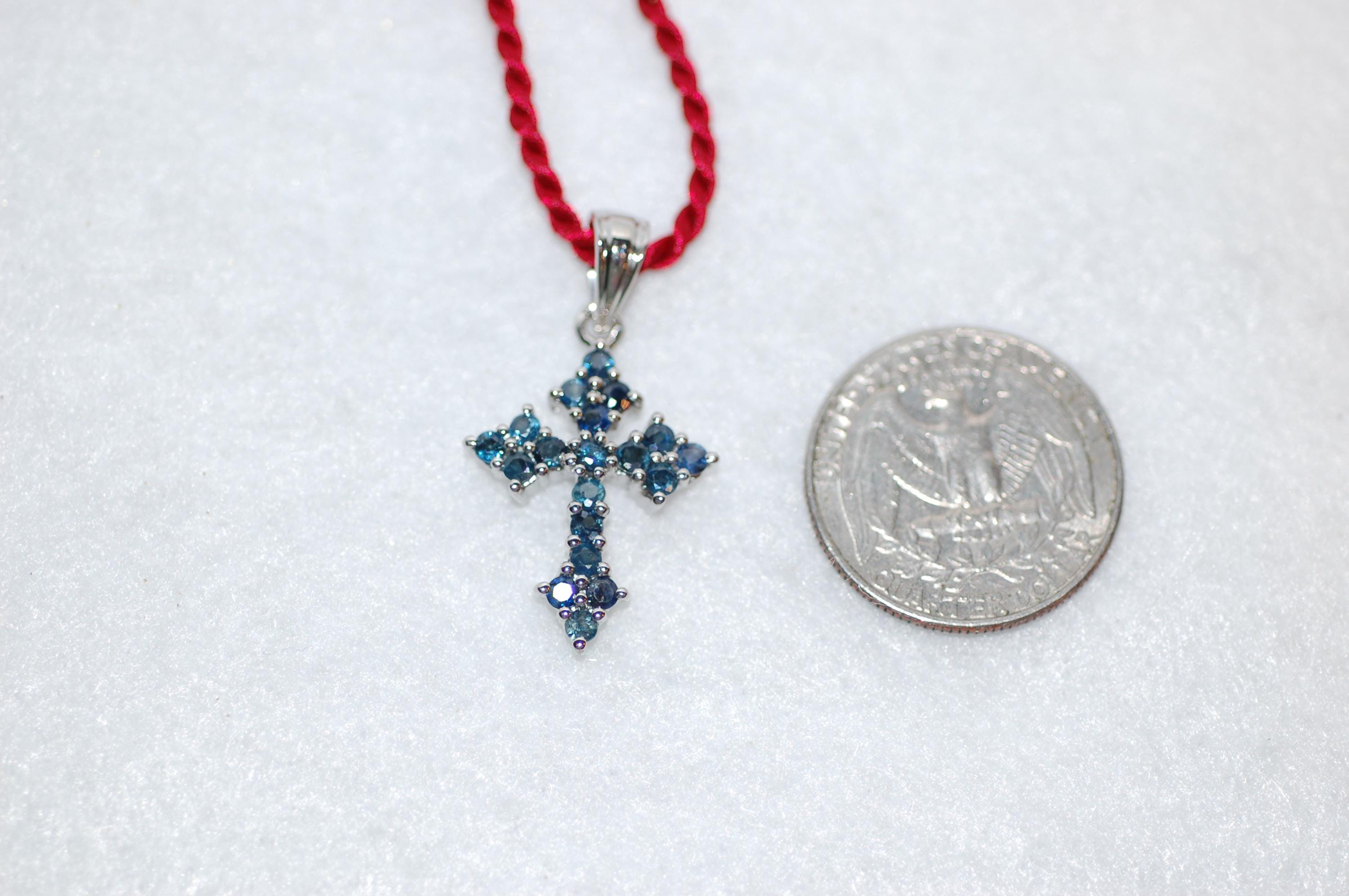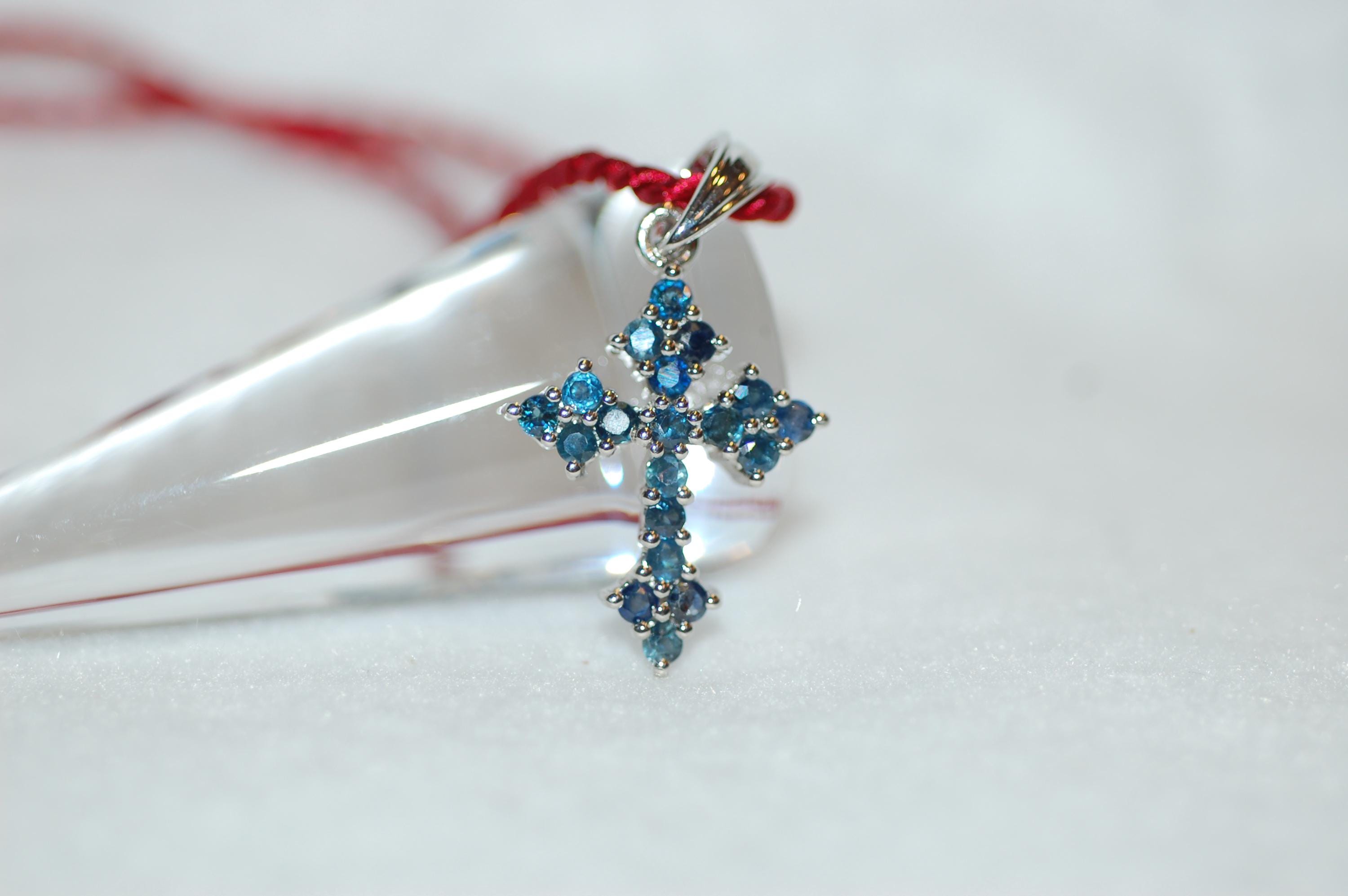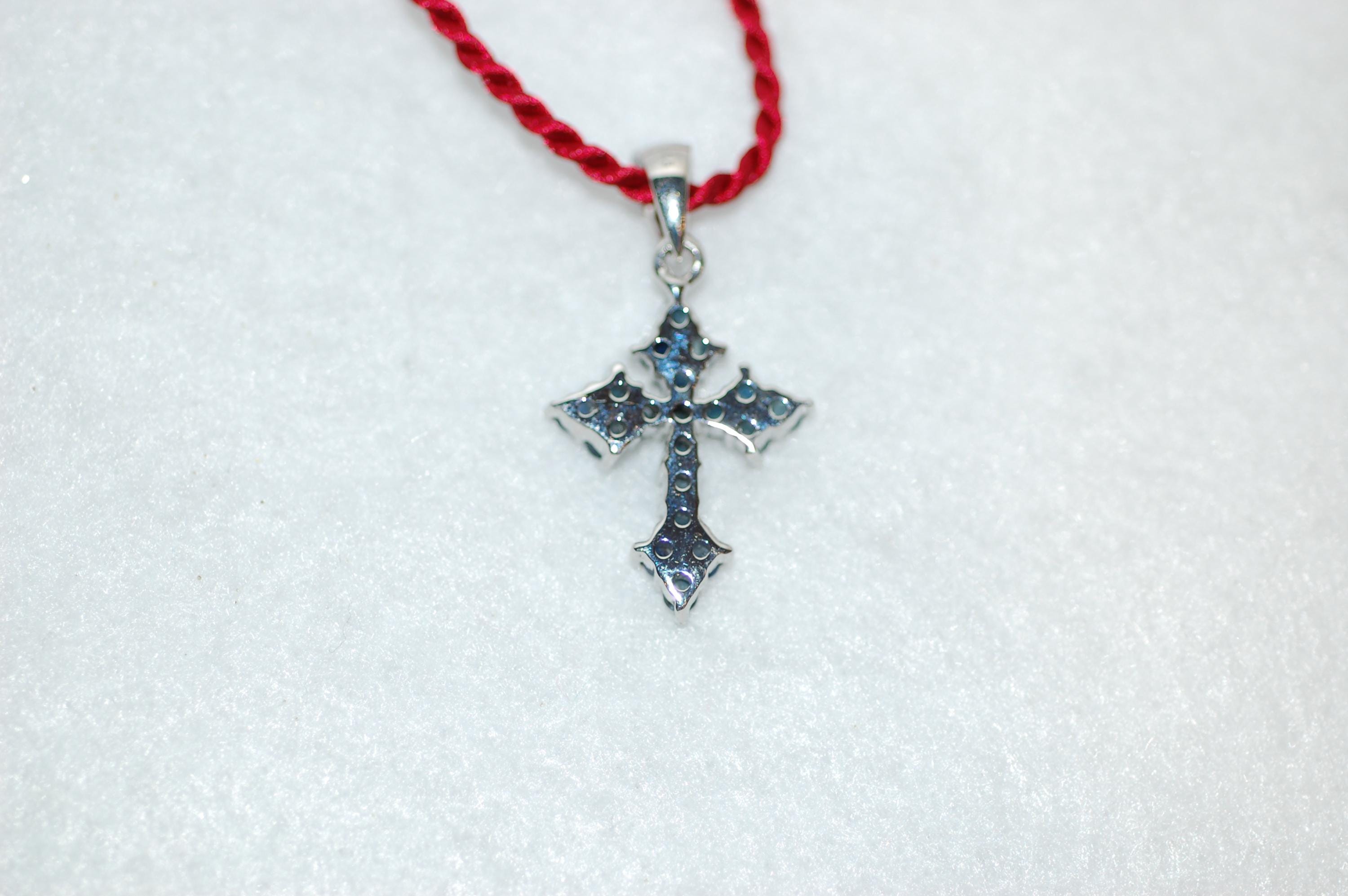 Beautiful cross in sapphires is a must have for the holidays! Faceted round blue sapphires are set in sterling silver in a floral design that evokes a medieval look. We paired the cross with a satin cord but can also be worn with a silver chain. The cross combines vintage charm with a contemporary aesthetic. A great gift for you or that special someone! 1.5ct sapphires, sterling silver, 1" long, .5" wide, 16" long cord, please inquire about other cord colors and lengths