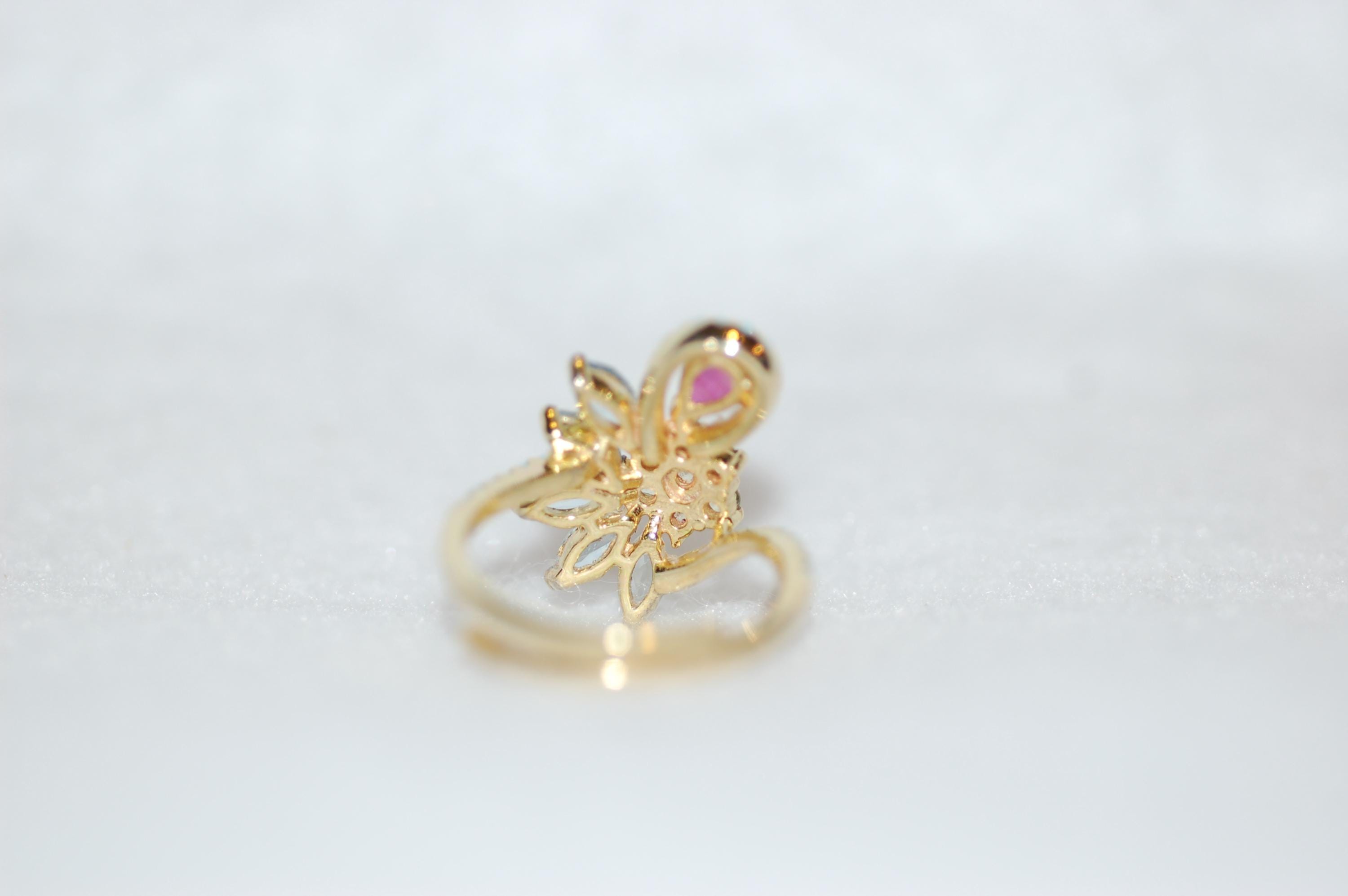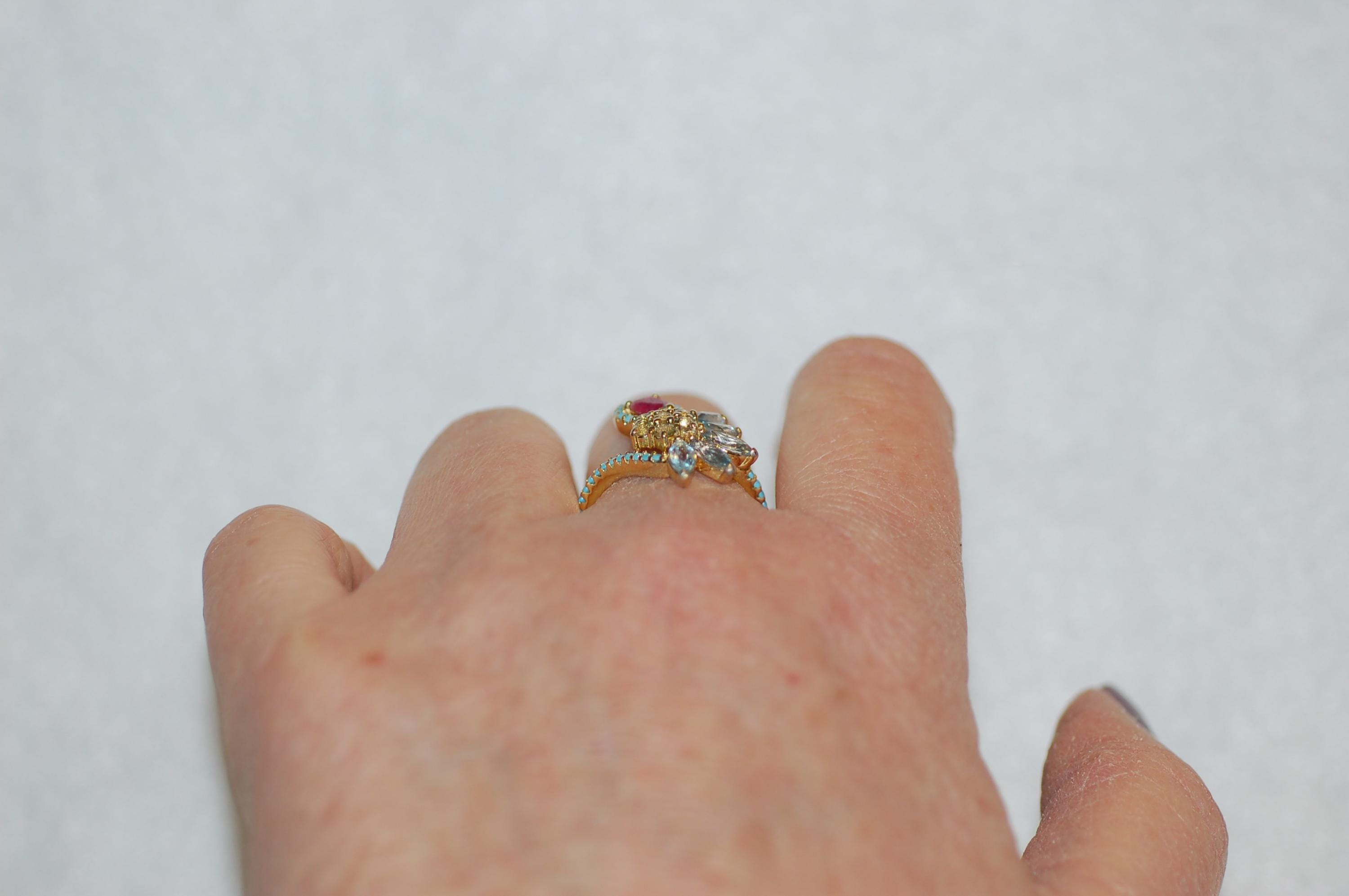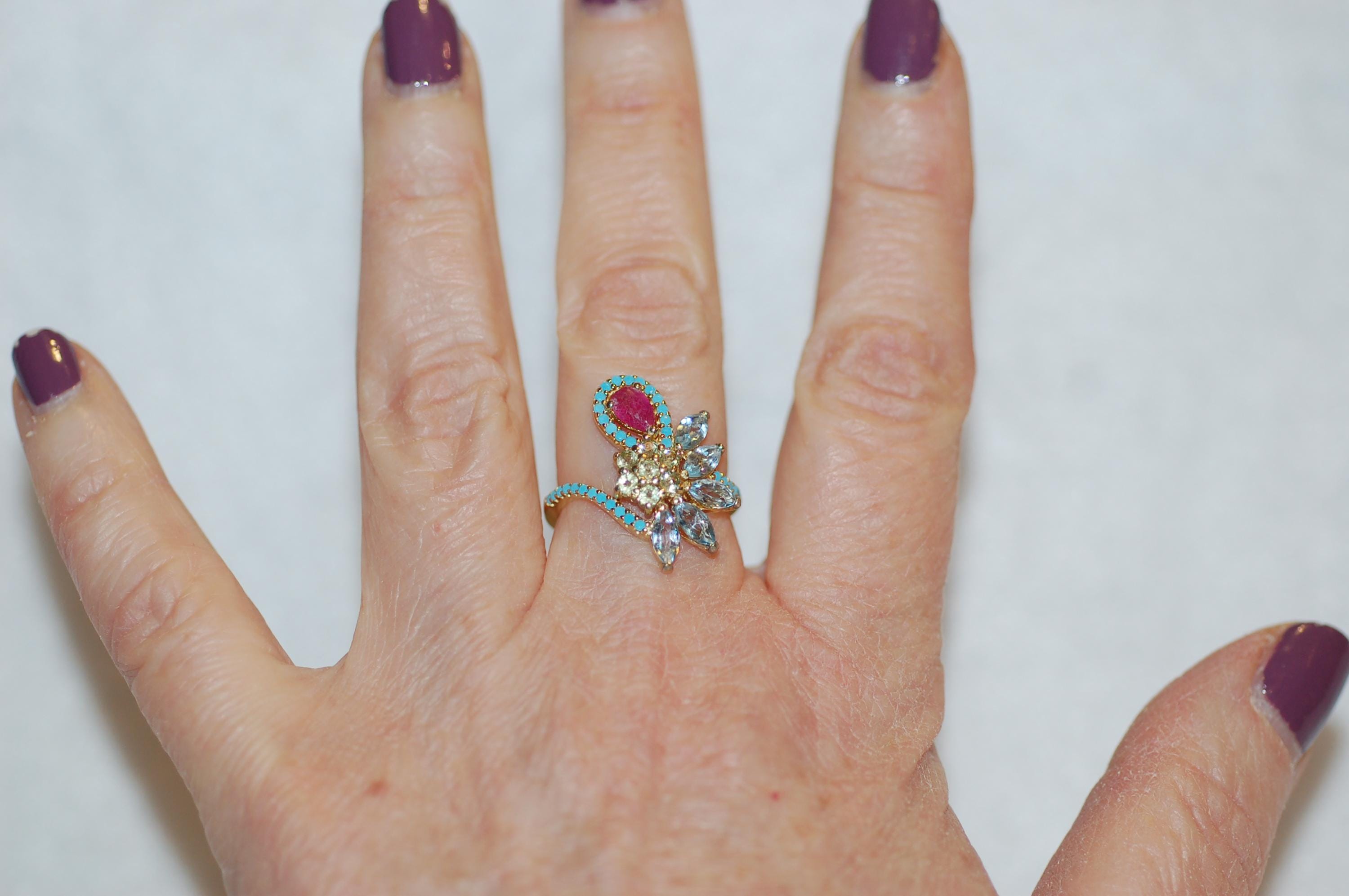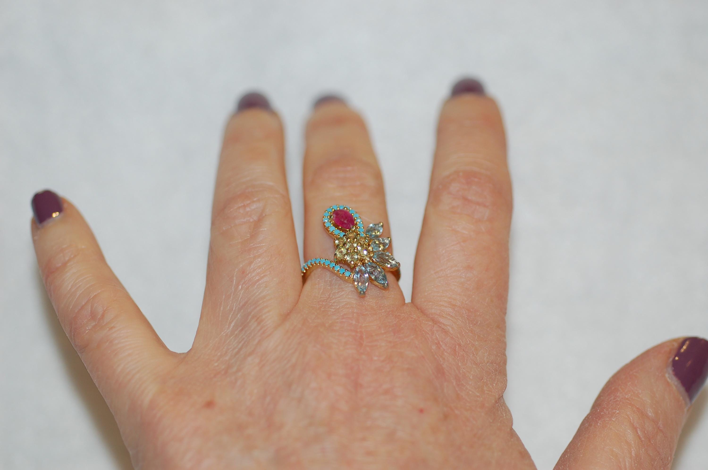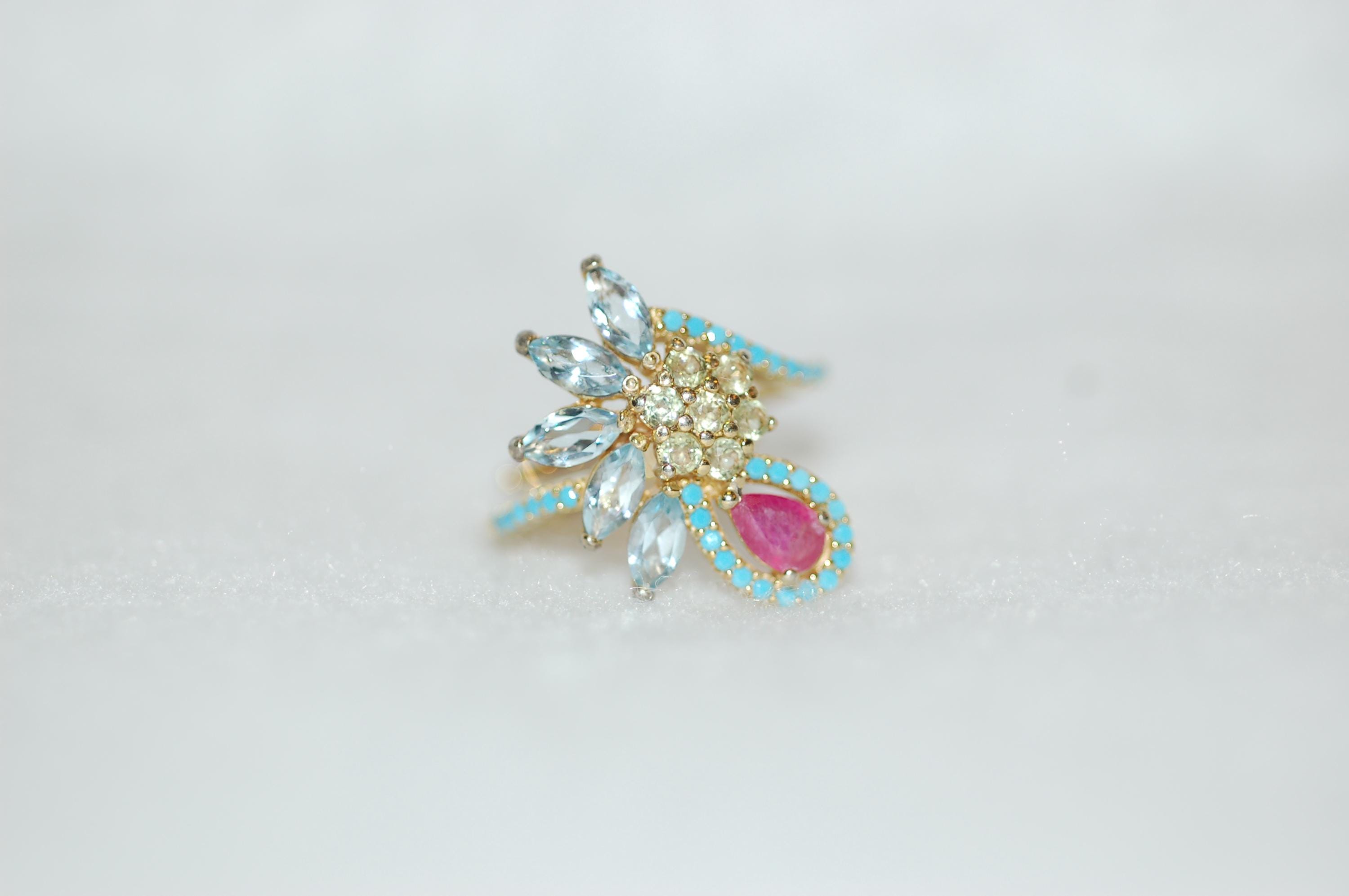 An elegant and intricate piece with a vibrant and luxurious design! A large pear shaped ruby, round citrines and marquis blue topazes are clustered together in a stylized fan design. The ruby is in a prong setting surrounded by micro turquoises. The bypass band is also set with micro turquoises and is adjustable. Its bright color palette of pink, blue, and gold gives it a lively, luxurious, and feminine appeal. A fun and wearable ring that is an eye catcher. .15ct ruby, .30ct citrine, .50ct blue topaz, turquoise, sterling silver, gold plating, ring size is adjustable