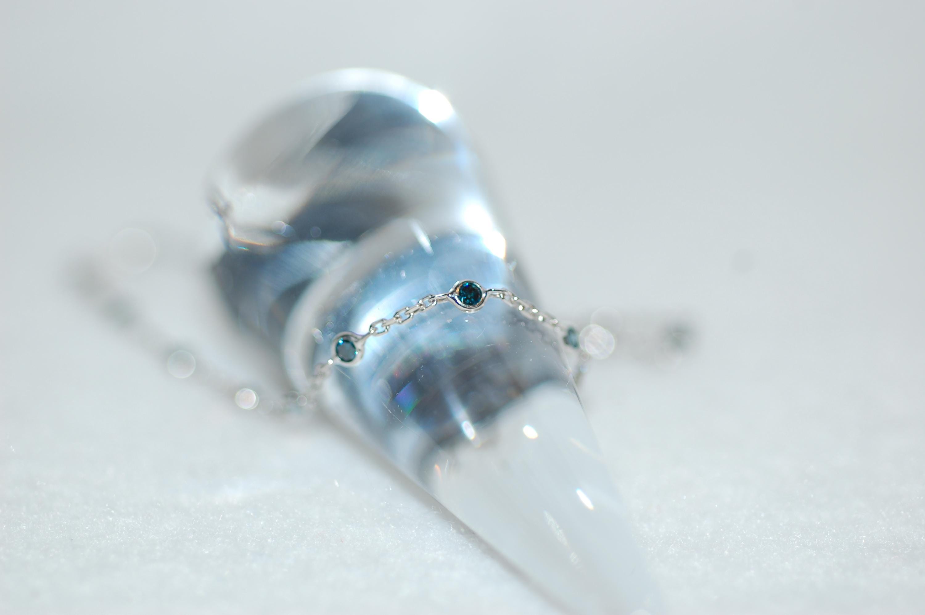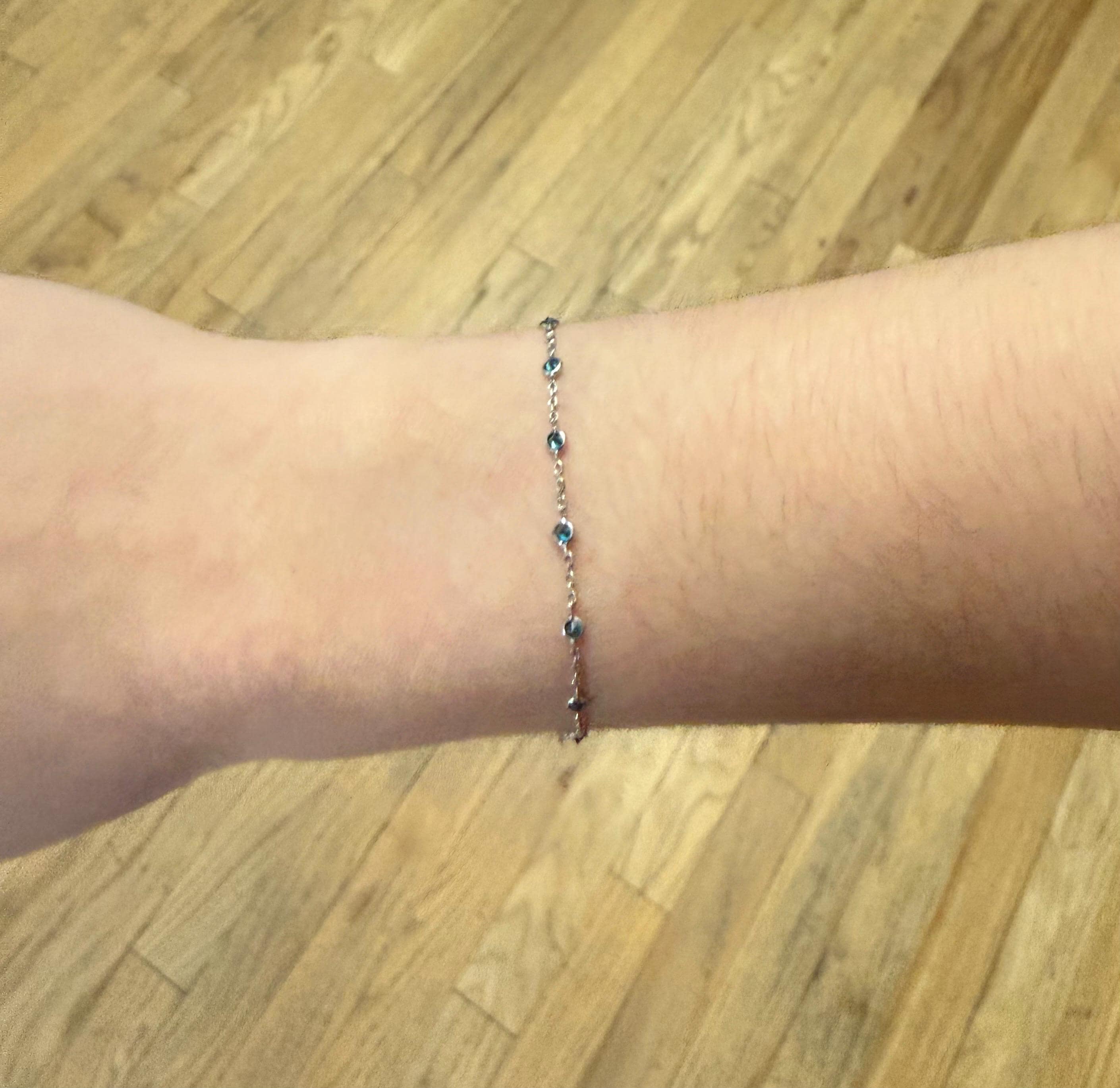 Elevate your jewelry collection with the Blue Diamonds Gold Bracelet, a stunning piece that perfectly combines minimalist elegance with a pop of vibrant color. Featuring 0.75 carats of faceted blue diamonds bezel-set in luminous 14K white gold, this bracelet offers a smooth, polished look that captures the light beautifully with every movement. The rich ocean-blue hue adds a subtle yet sophisticated splash of color, making it an ideal accessory for both everyday wear and special occasions.