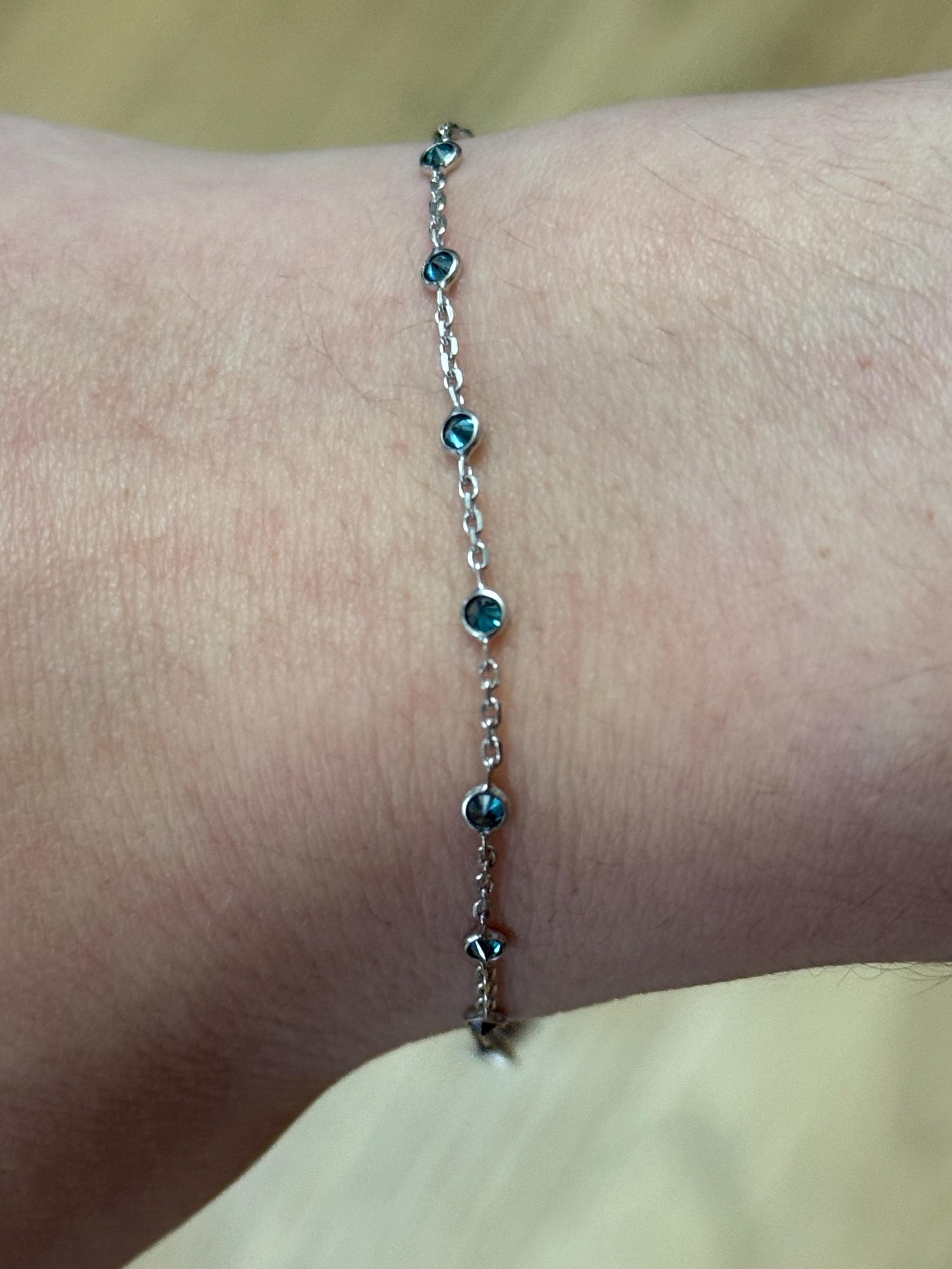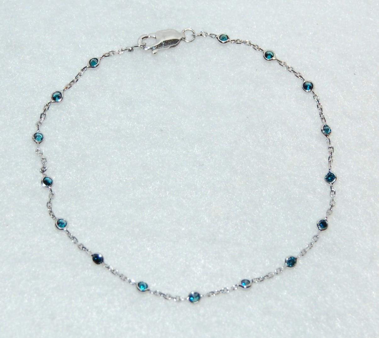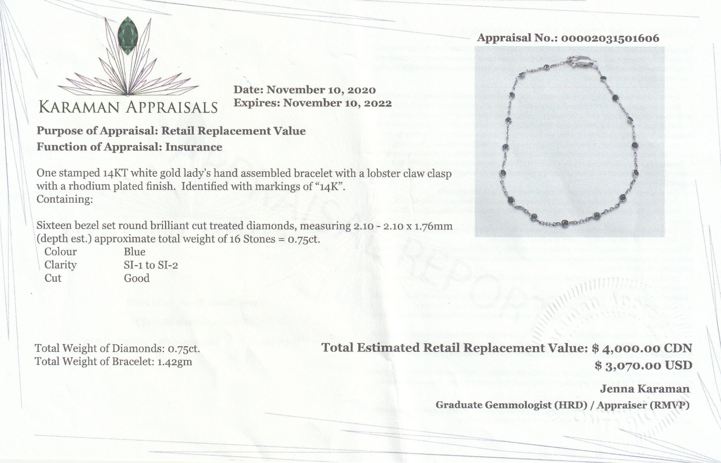 Add a touch of luxury and a splash of color to your jewelry wardrobe with this exquisite Blue Diamonds Gold Bracelet — a timeless piece that captures elegance in every detail. .75ct diamonds, 14K white gold, 7" long