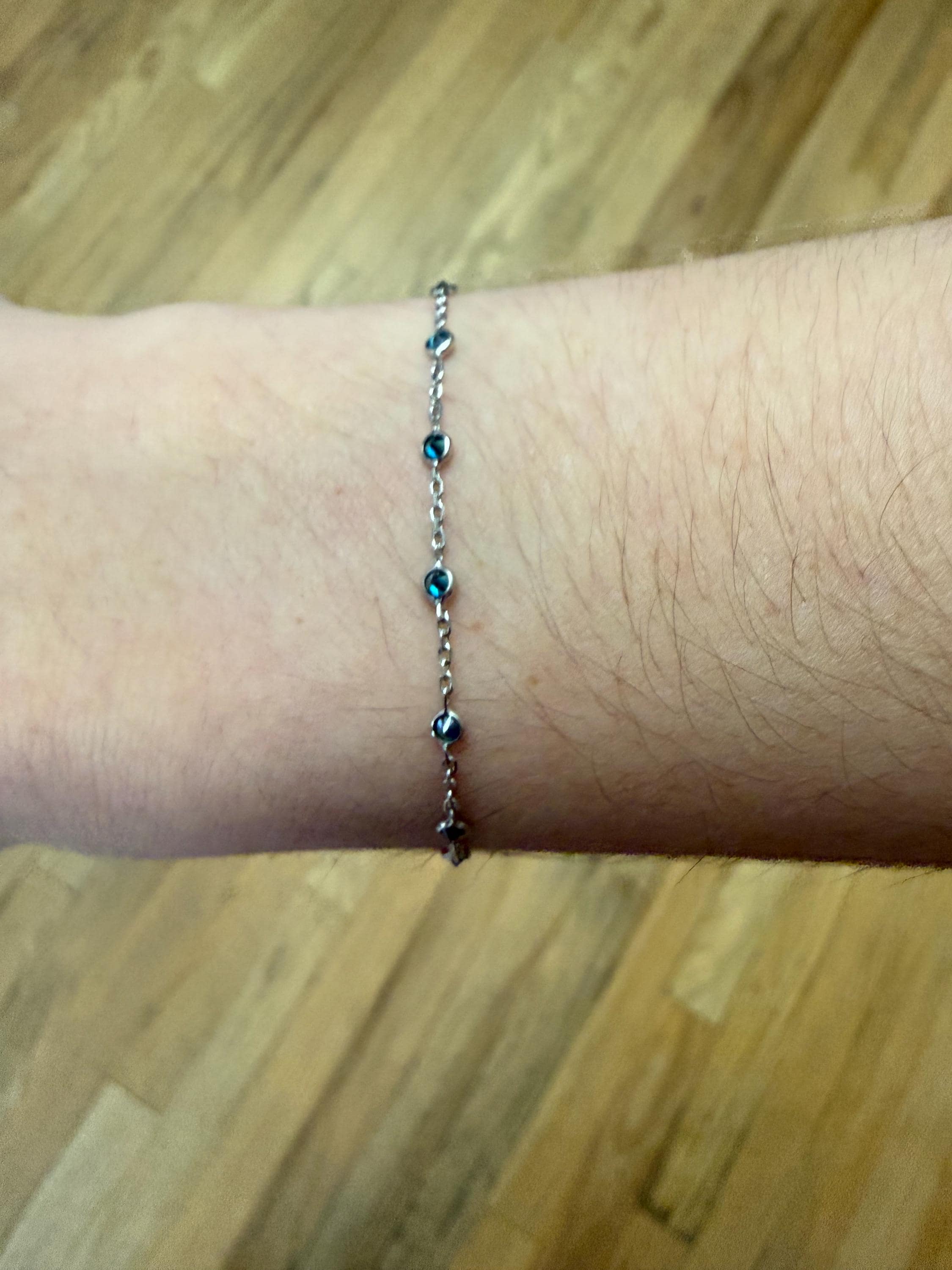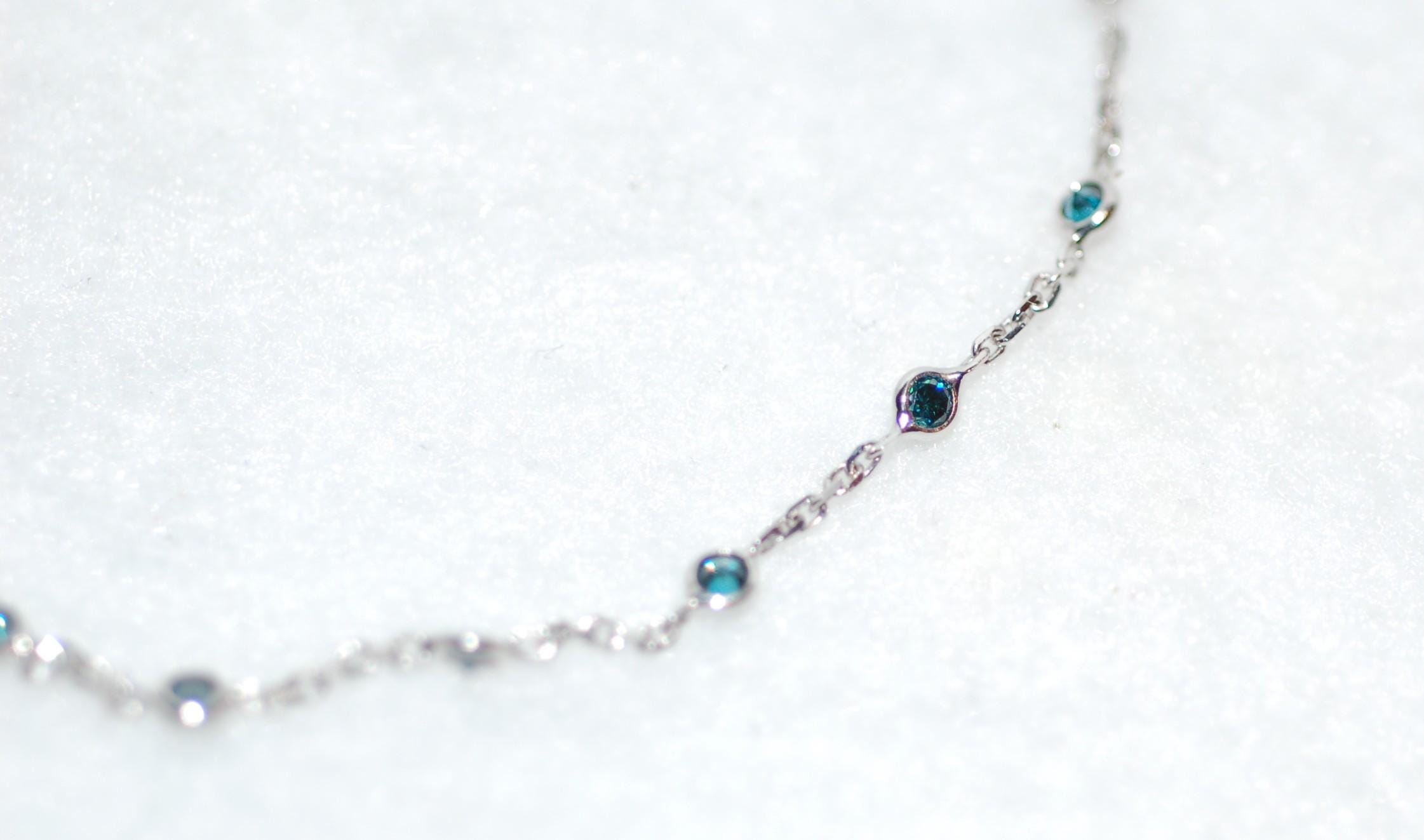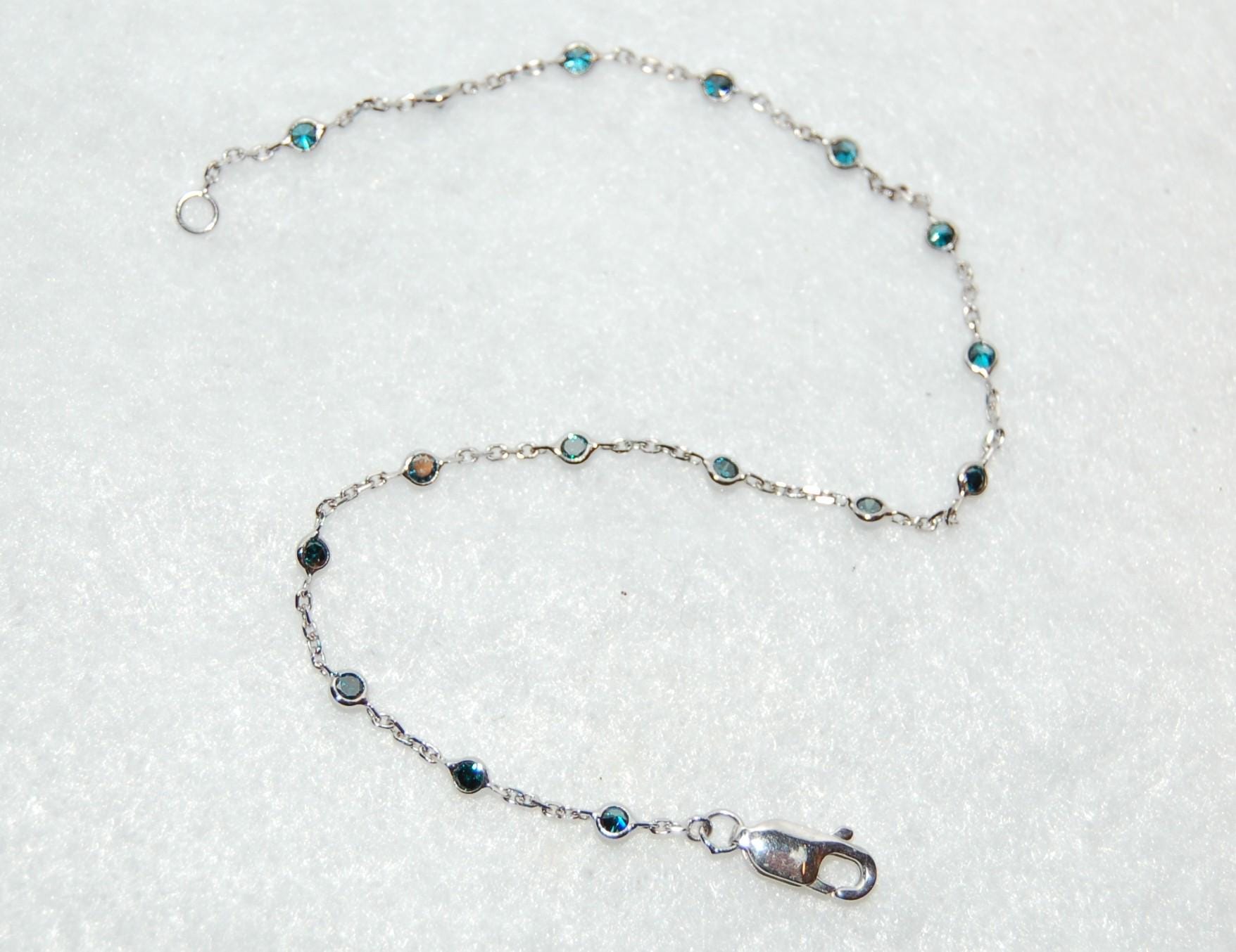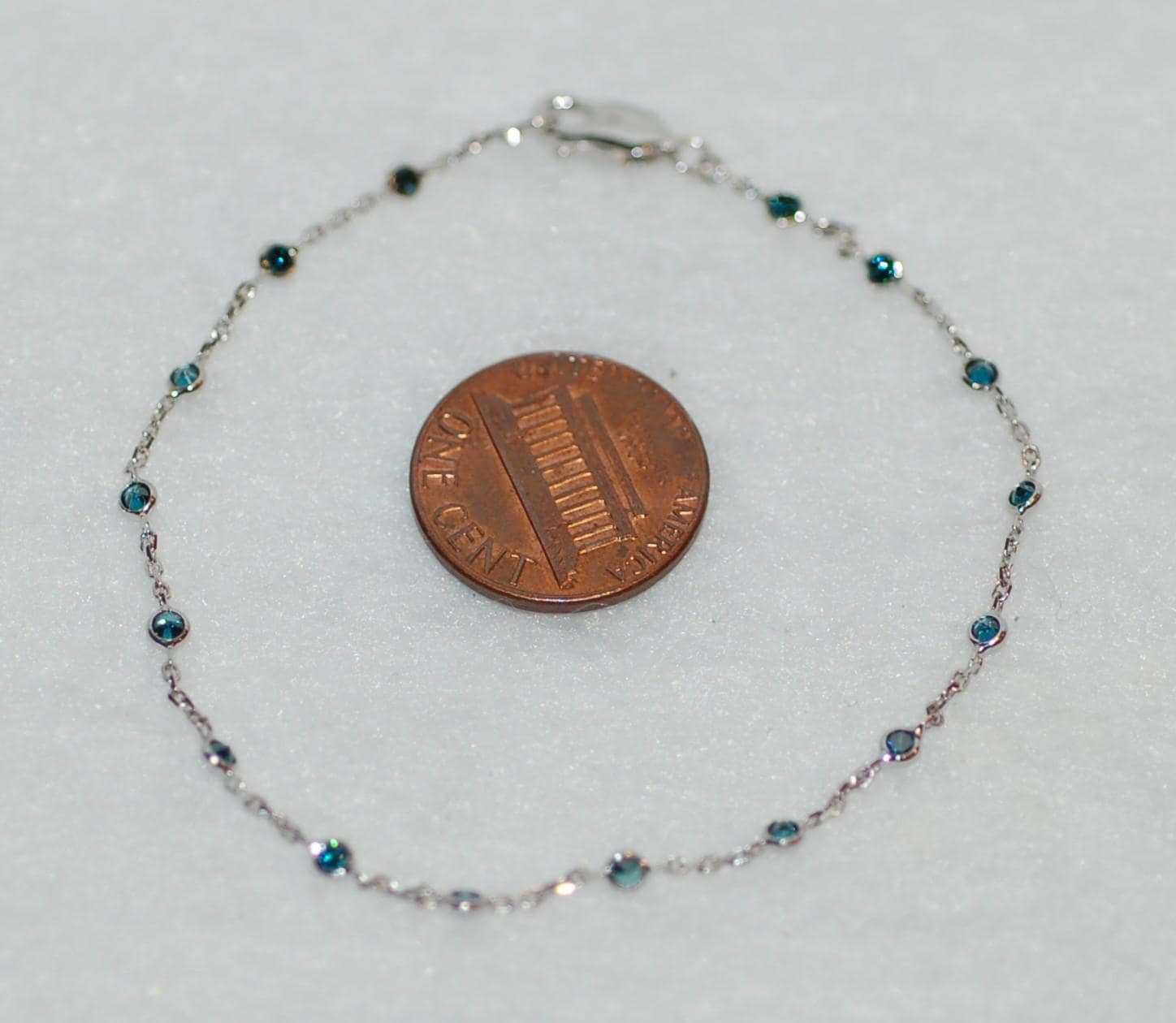Add a touch of luxury and a splash of color to your jewelry wardrobe with this exquisite Blue Diamonds Gold Bracelet — a timeless piece that captures elegance in every detail. .75ct diamonds, 14K white gold, 7" long