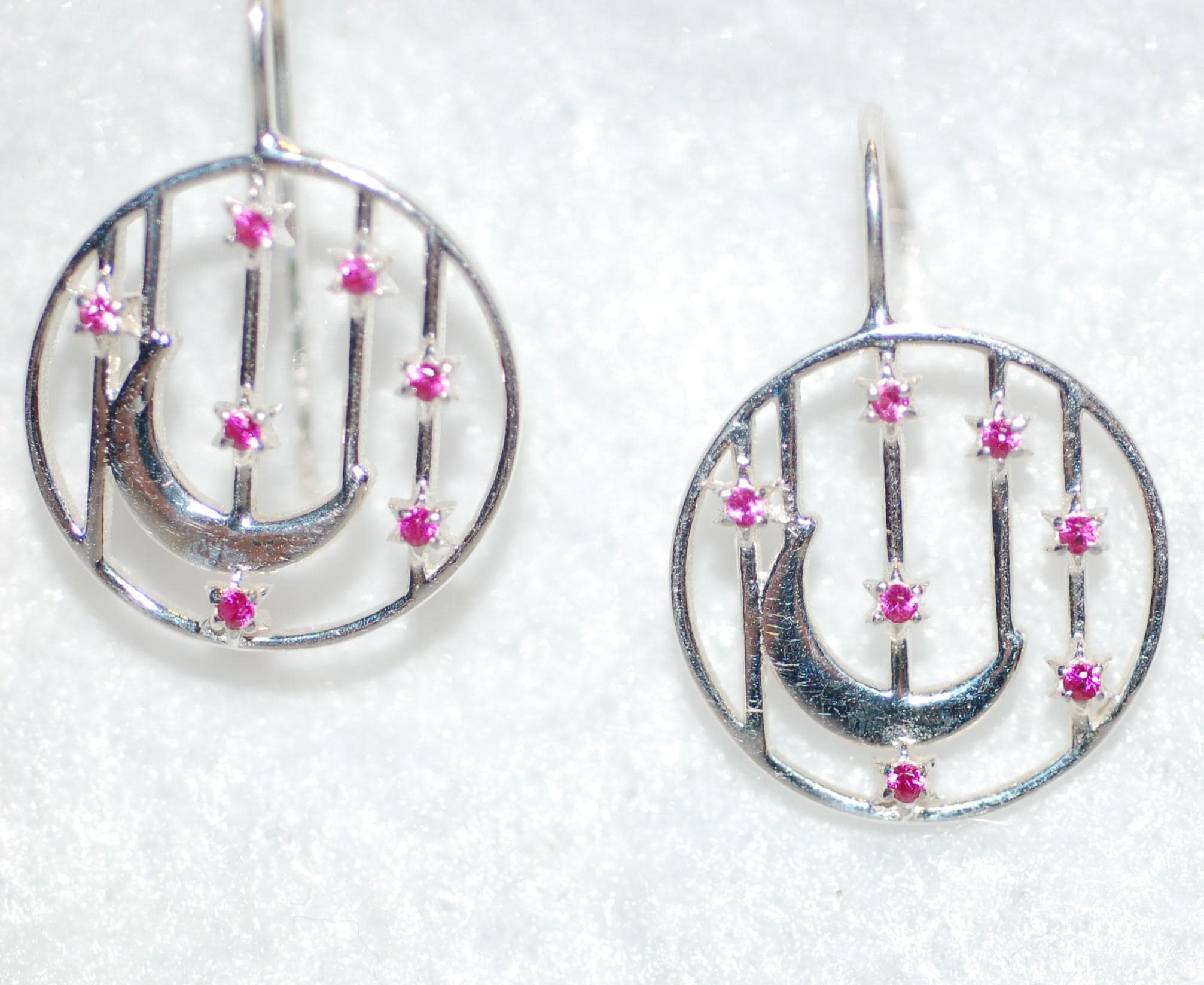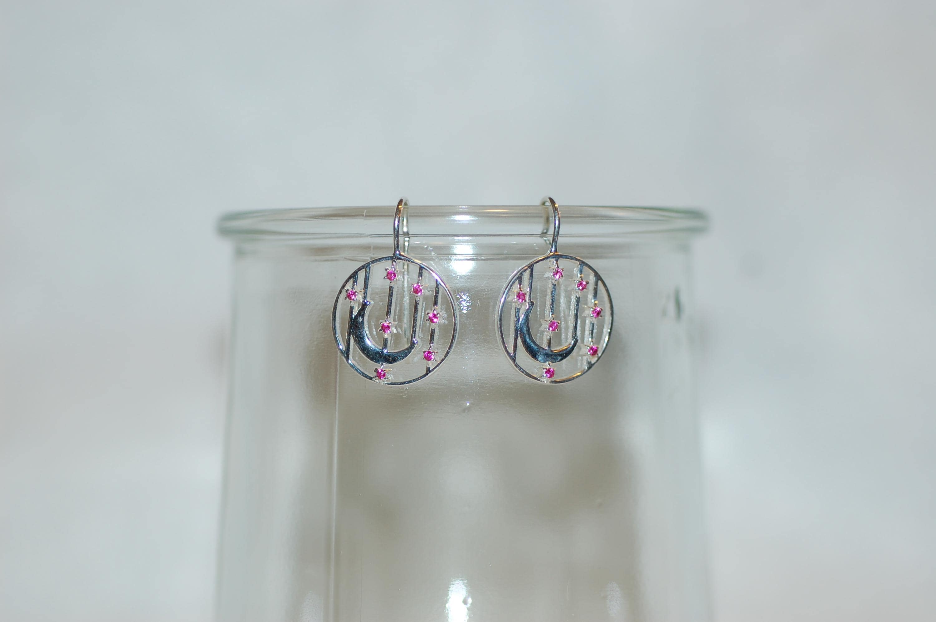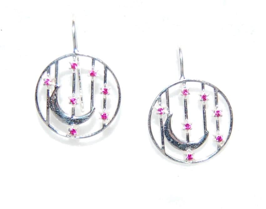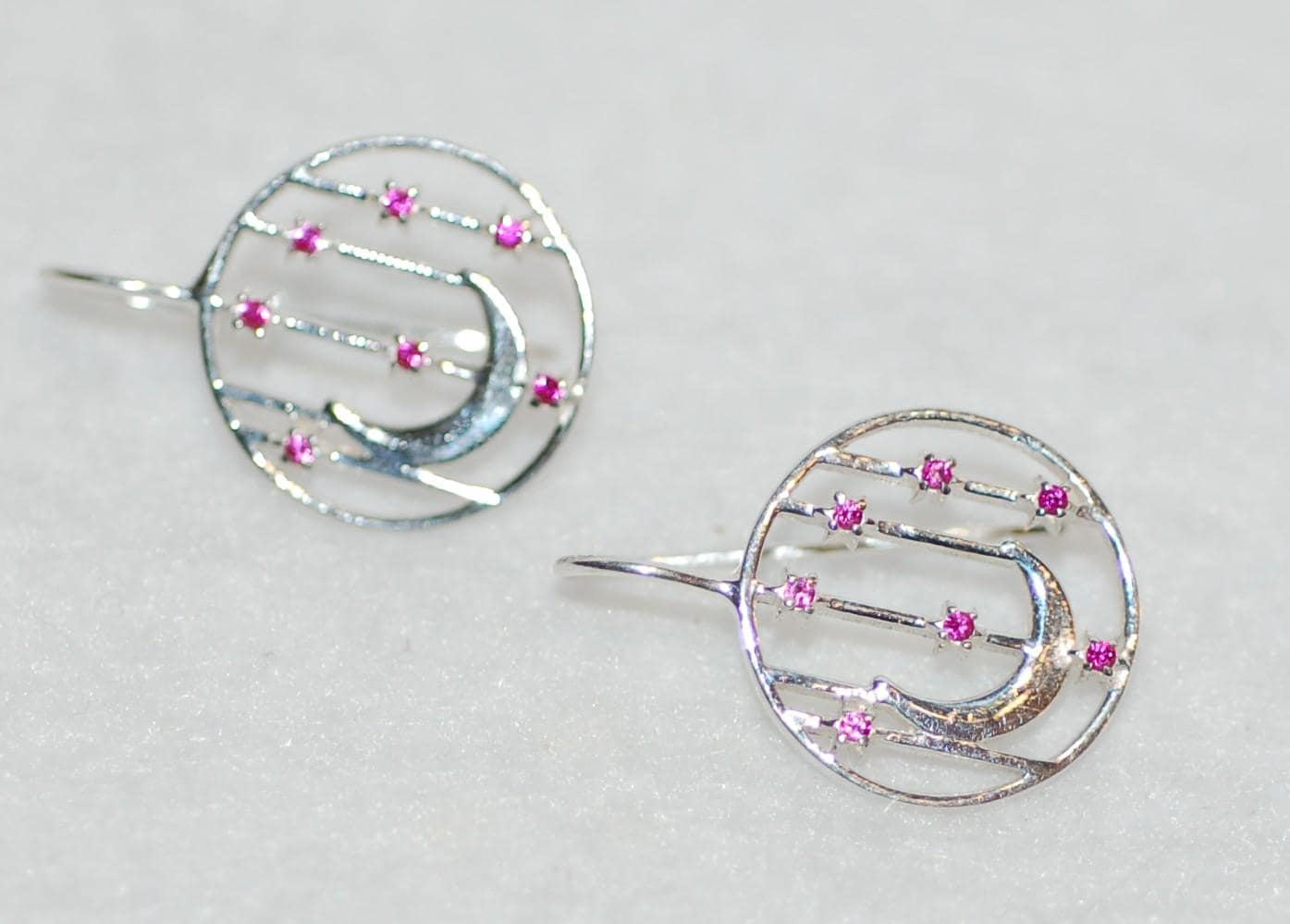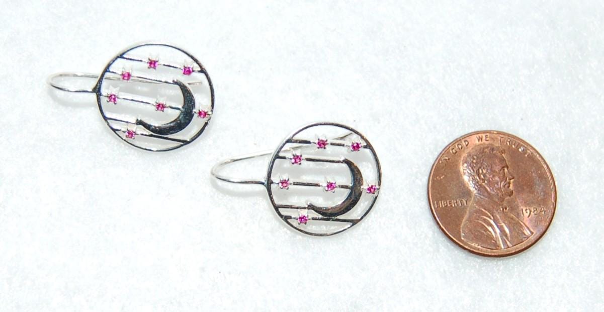 Perfect for gifting or treating yourself, these ruby earrings add a pop of color and celestial elegance to any outfit. To keep them looking their best, avoid contact with harsh chemicals and store in a jewelry box when not in use. Elevate your style with these enchanting ruby accented earrings today!