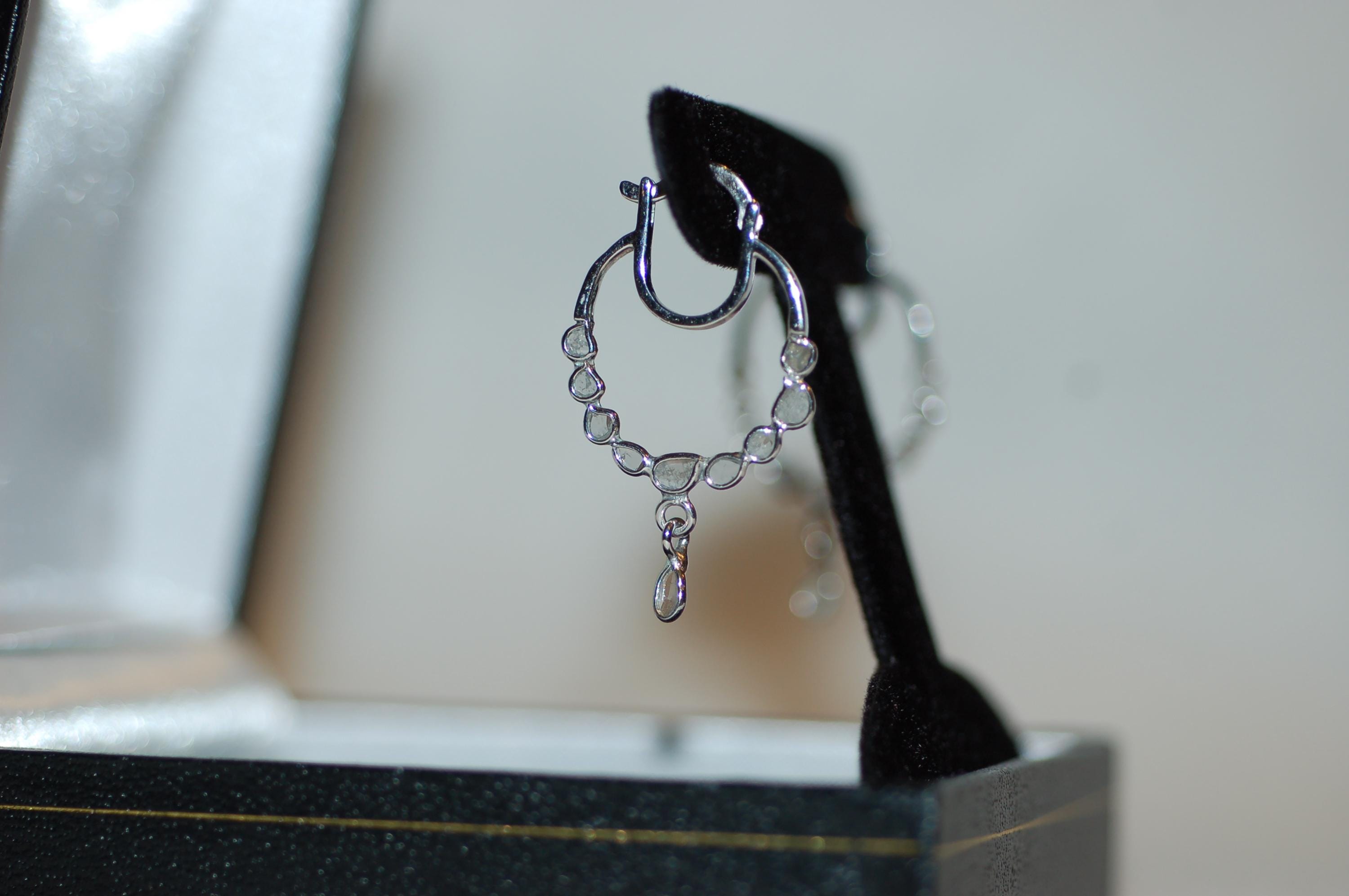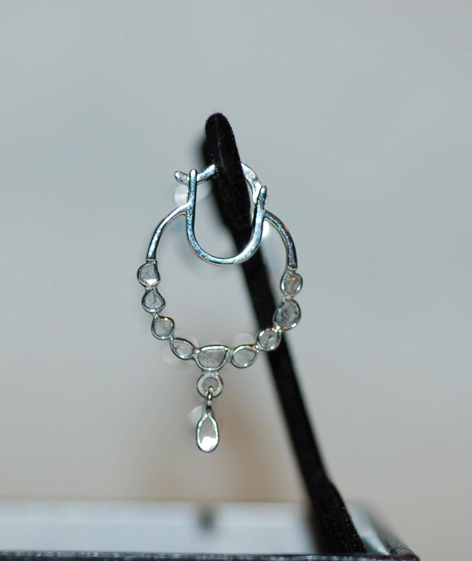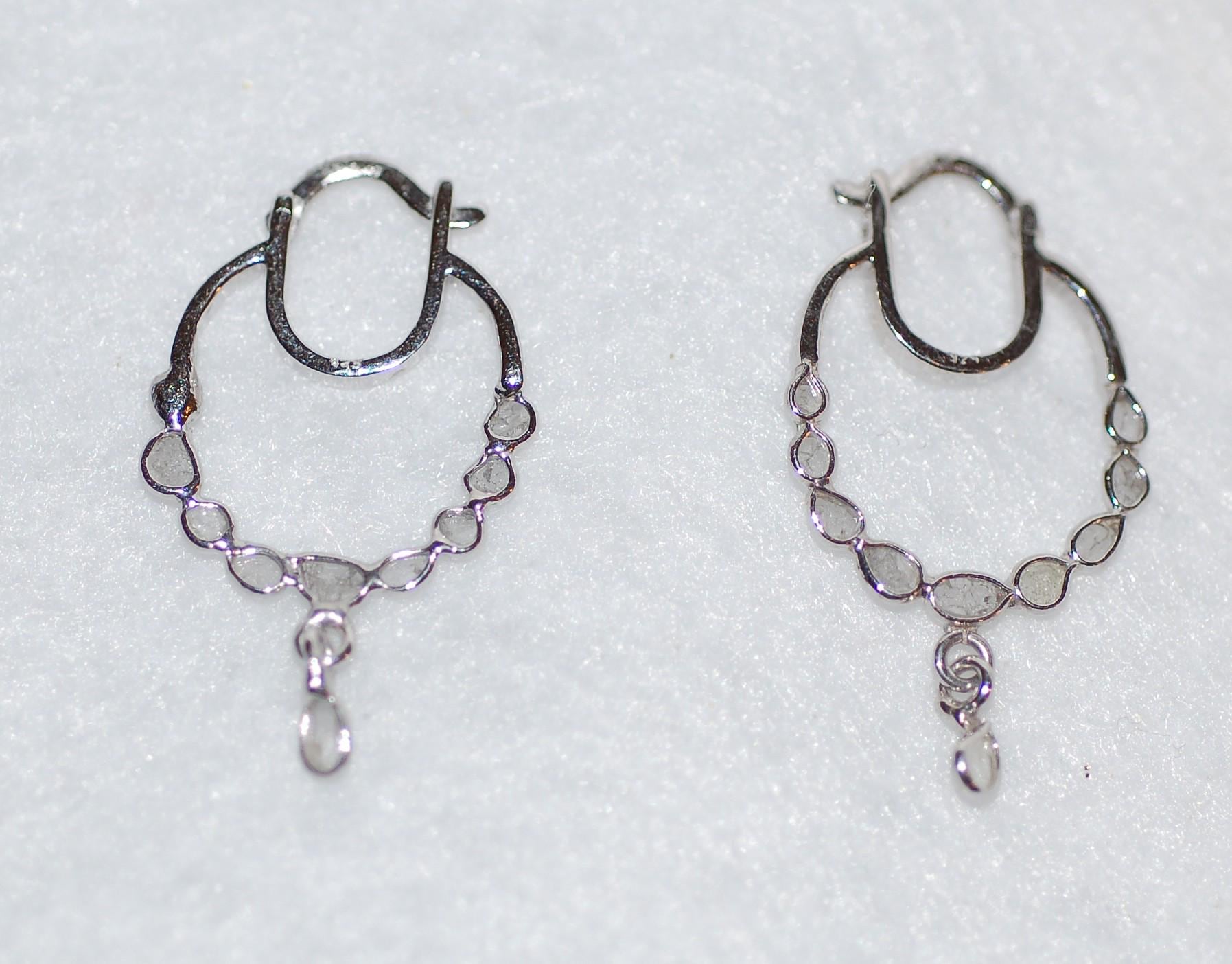Adorned with natural inclusions that add unique character, both earring showcases a total diamond weight of 0.35 carats, highlighting the beauty of rose cut diamonds and their vintage-inspired charm. A charming drop charm dangles gracefully from the hoops, adding just the right touch of sophistication and modern flair.