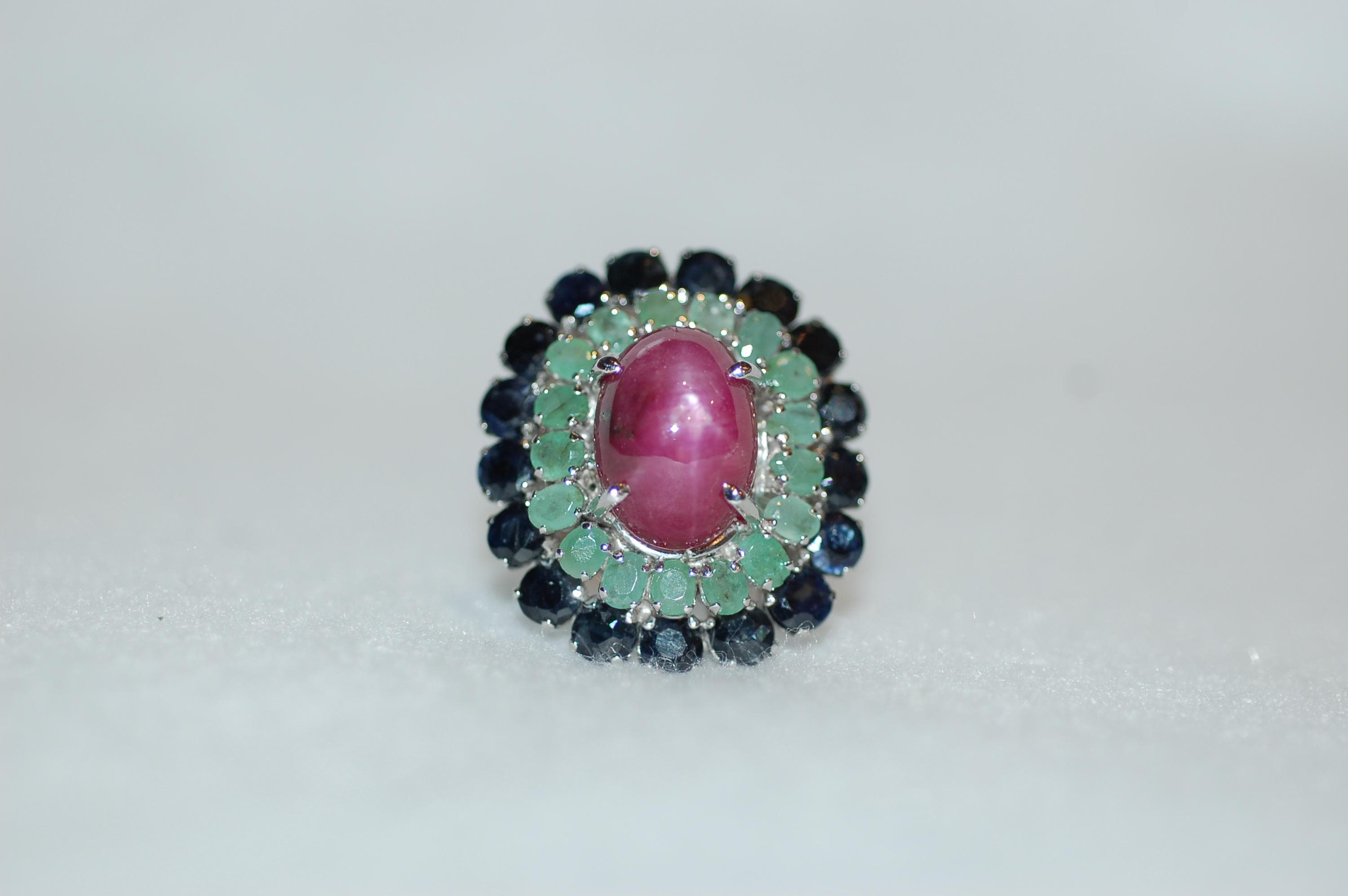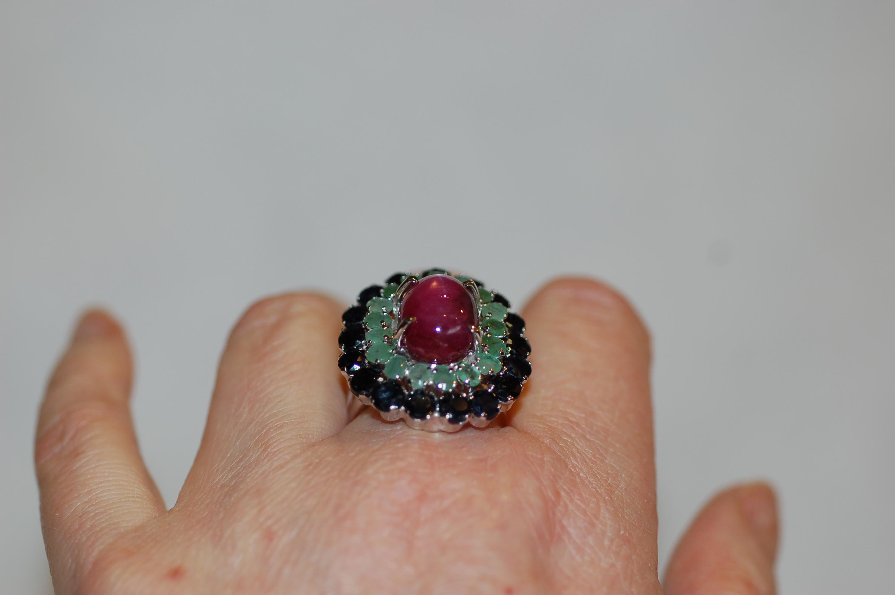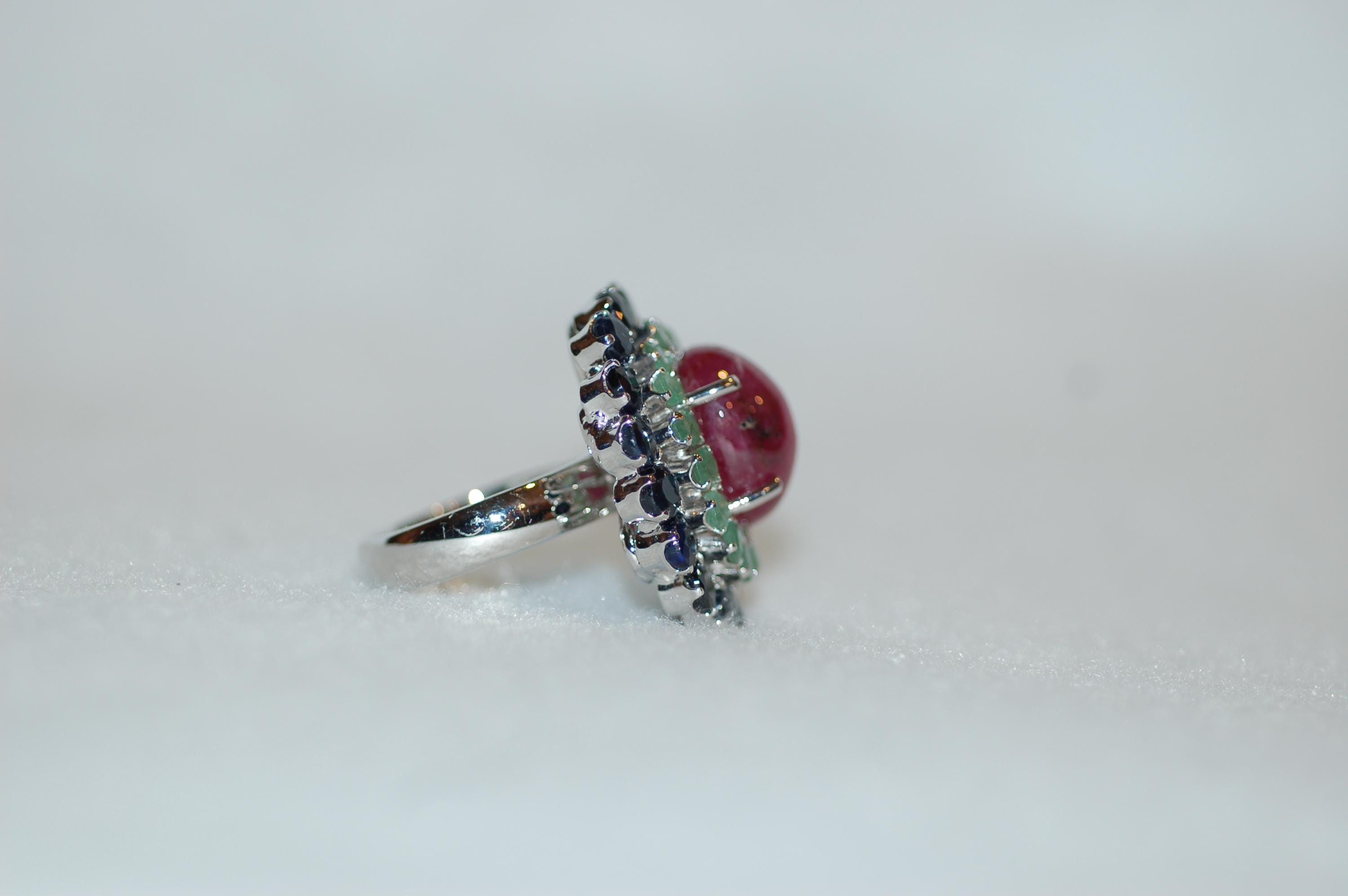 Make a bold statement with this stunning Ruby Cabochon, Sapphire, and Emerald Sterling Silver Ring — a true centerpiece for any jewelry collection. Crafted with exquisite attention to detail, this cocktail ring features a vibrant 4-carat ruby cabochon, showcasing its natural inclusions that add to its unique charm. Surrounding the ruby are faceted sapphires totaling 1.5 carats and luminous 1-carat faceted emeralds, creating a vibrant, colorful display that catches the light from every angle.