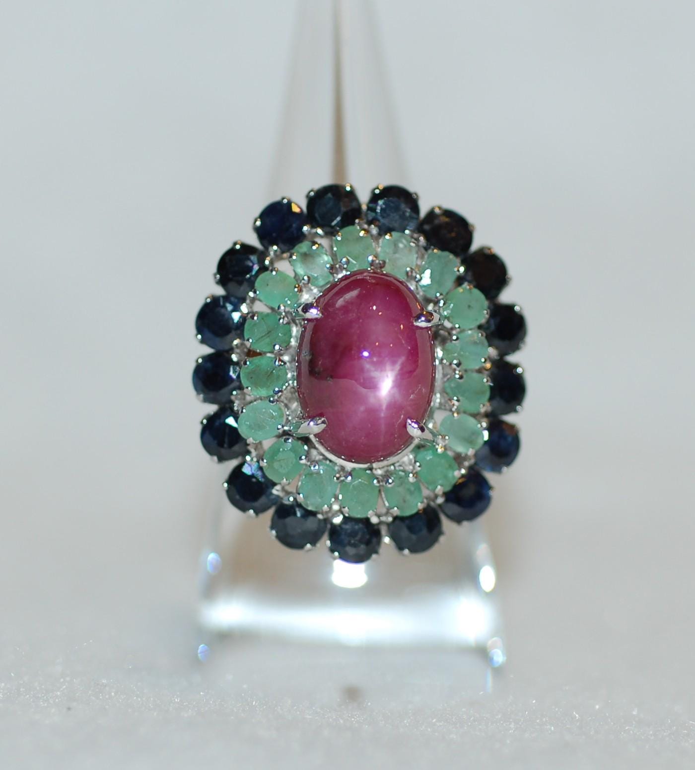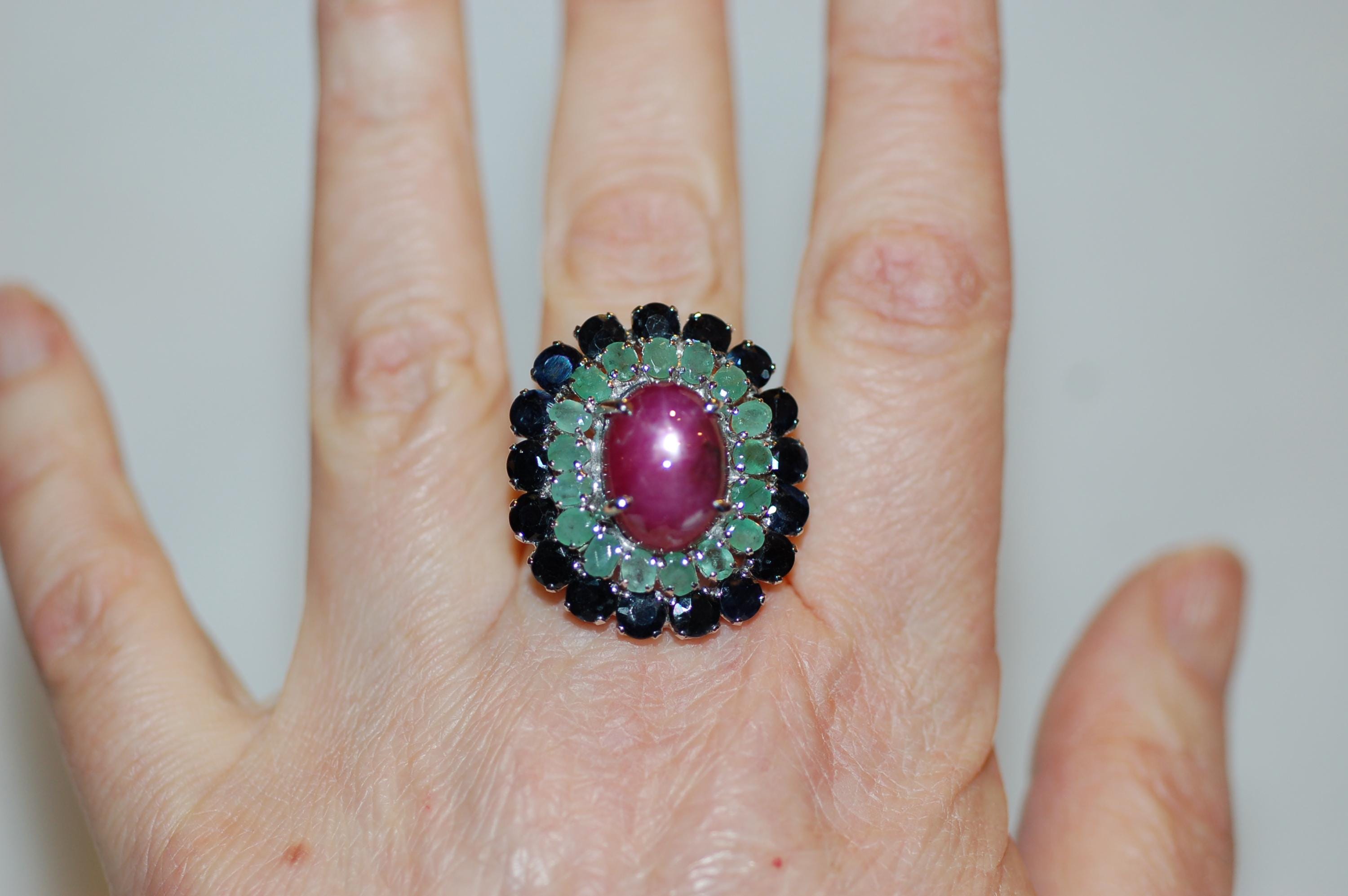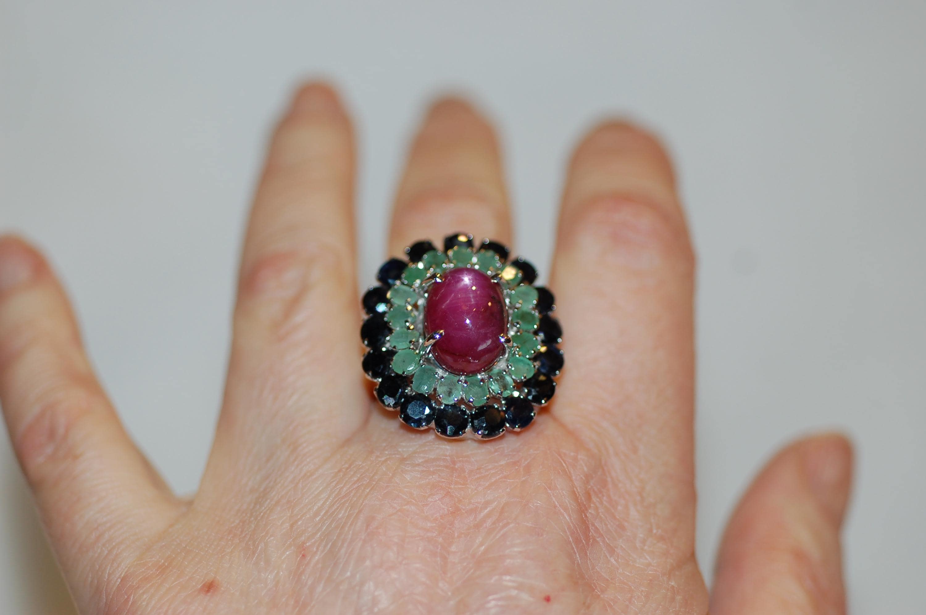 Make a bold statement with this stunning Ruby Cabochon, Sapphire, and Emerald Sterling Silver Ring — a true centerpiece for any jewelry collection. Crafted with exquisite attention to detail, this cocktail ring features a vibrant 4-carat ruby cabochon, showcasing its natural inclusions that add to its unique charm. Surrounding the ruby are faceted sapphires totaling 1.5 carats and luminous 1-carat faceted emeralds, creating a vibrant, colorful display that catches the light from every angle.