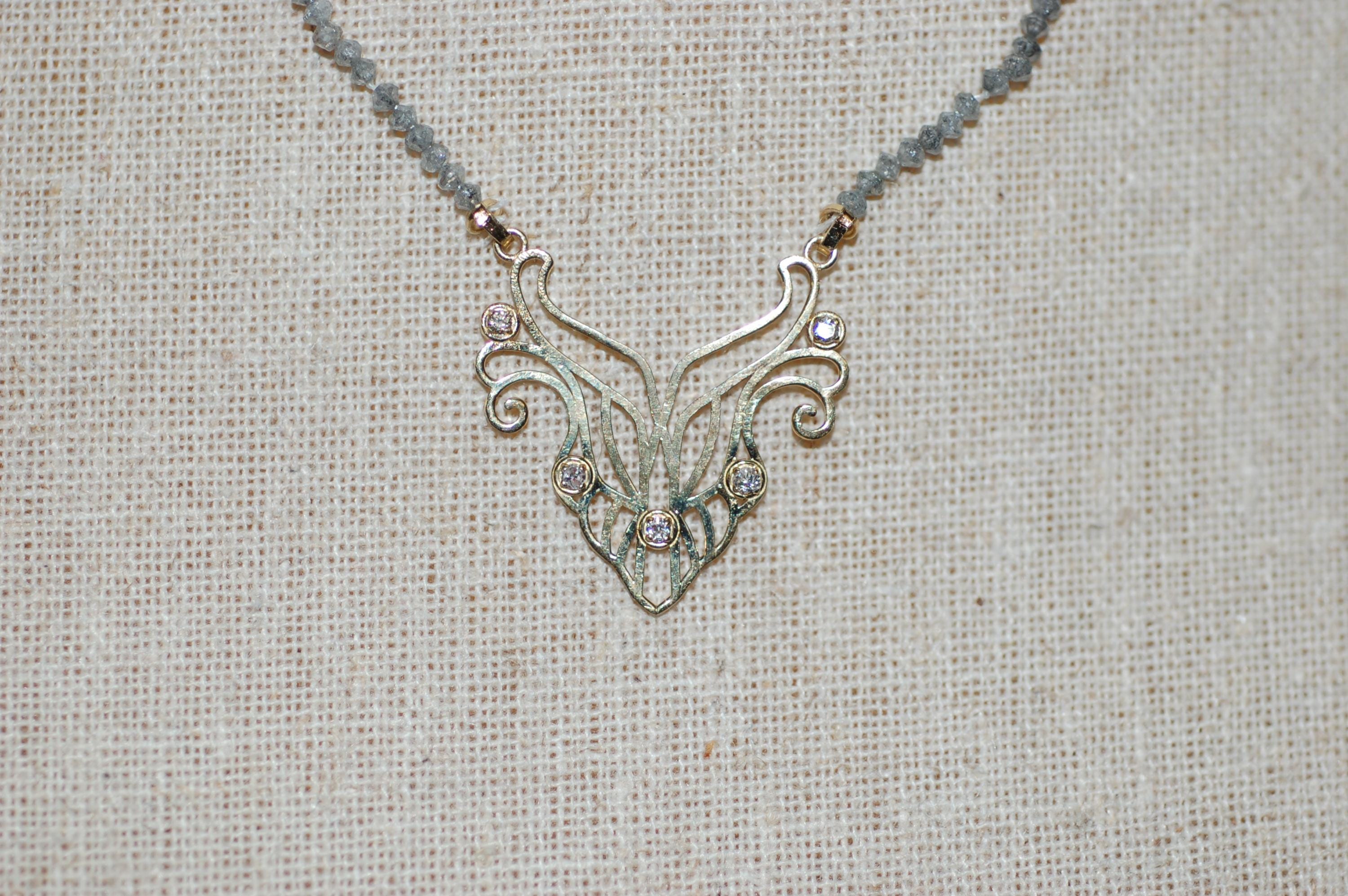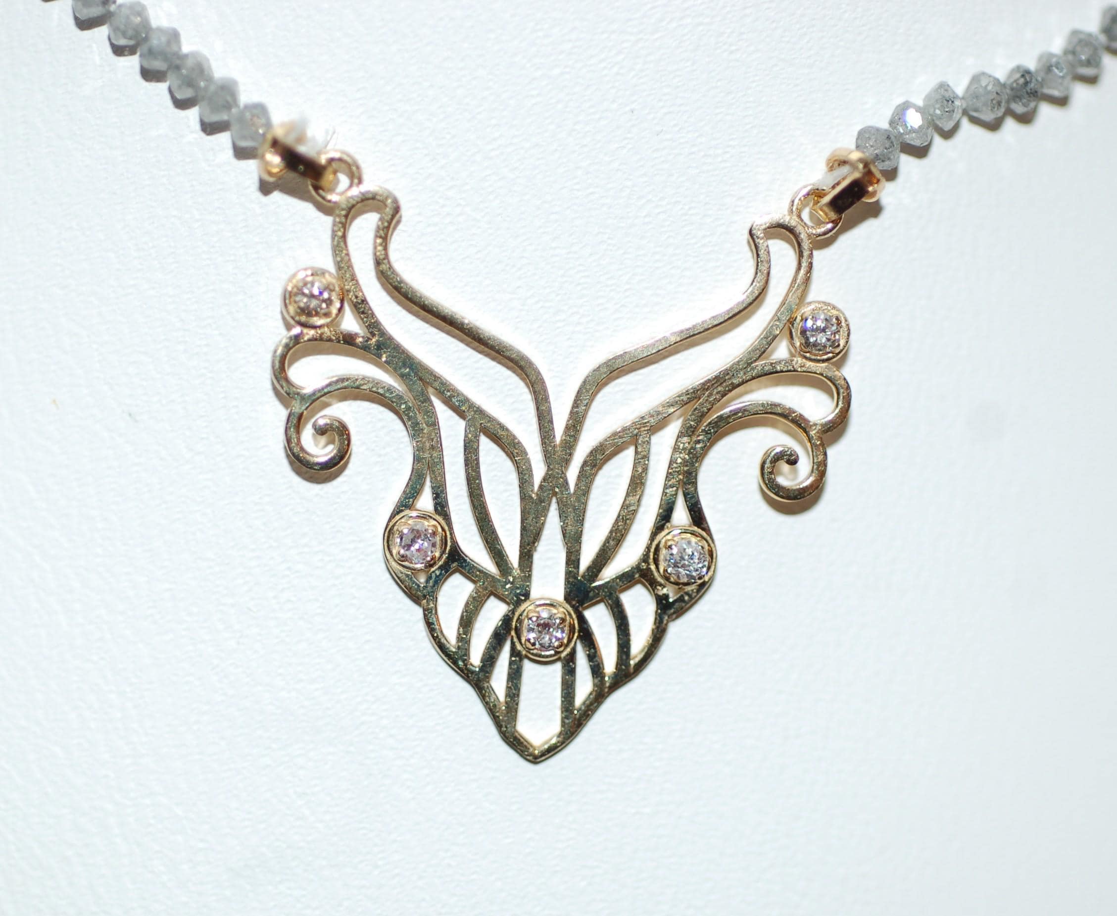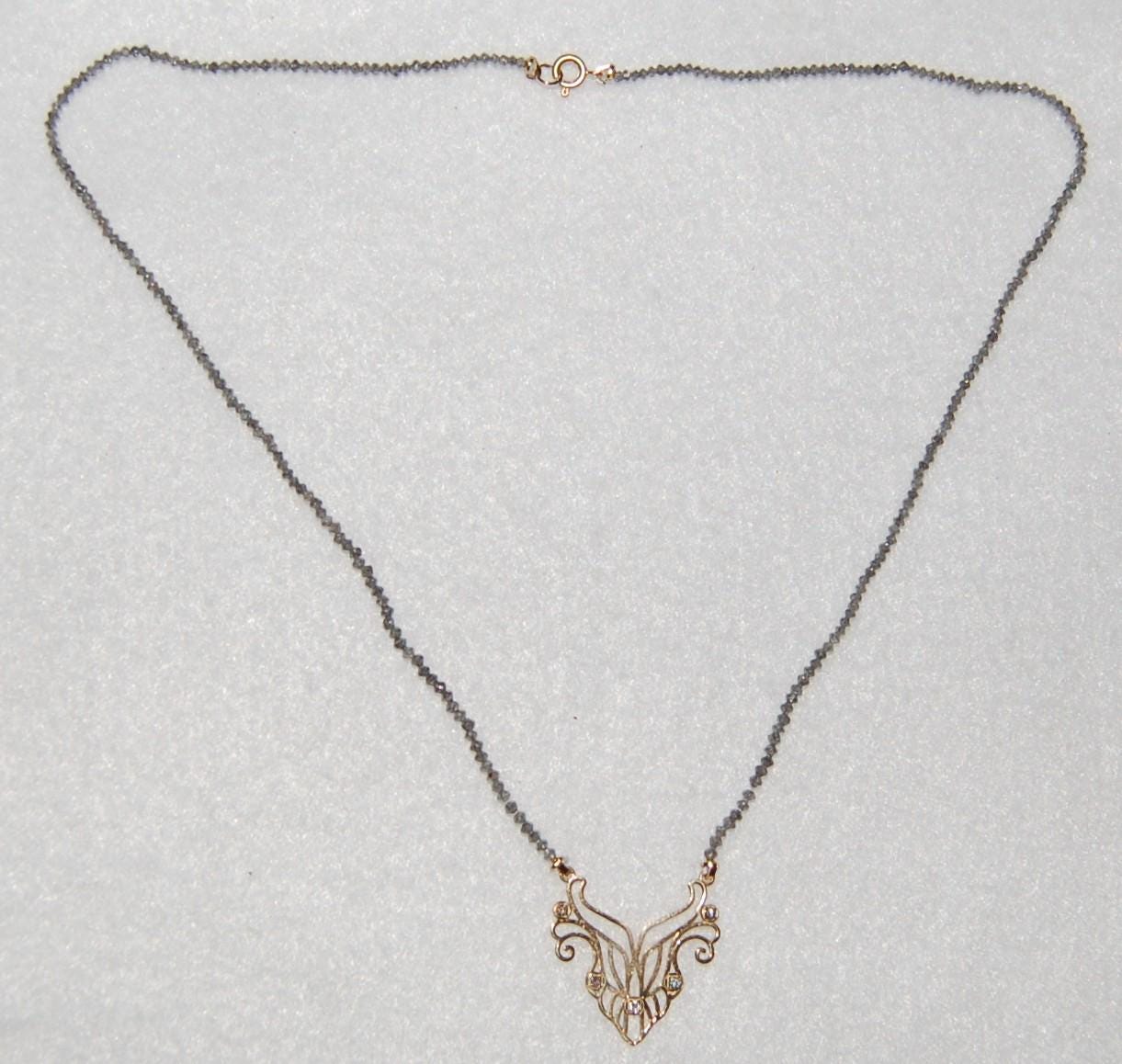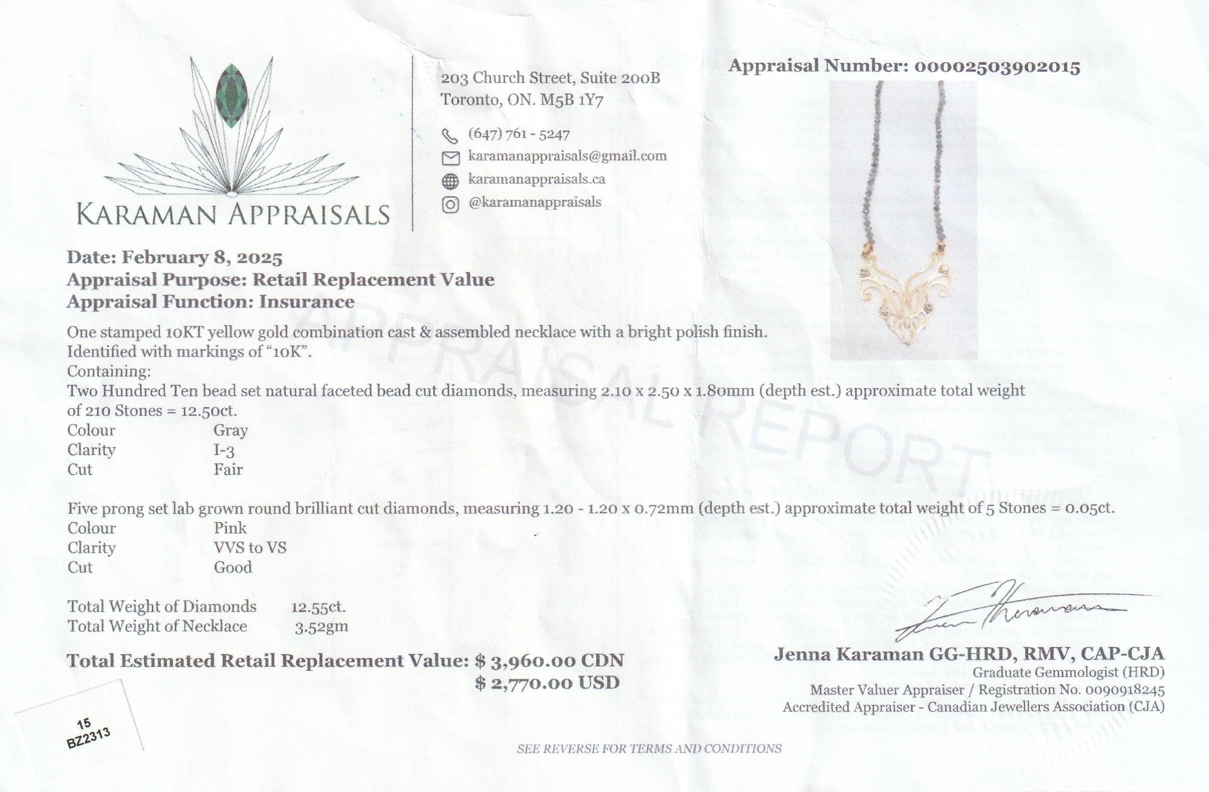 Elevate your jewelry collection with this stunning Diamond Beads and Fancy Scroll 10K Yellow Gold Necklace. Crafted with exquisite attention to detail, this necklace features a beautifully designed gold scroll centerpiece adorned with .05ct pale pink lab-grown diamonds, adding a touch of soft elegance and sparkle. The necklace is further enhanced by 12.5ct natural gray diamond faceted beads that catch the light from every angle, creating a captivating shimmer.