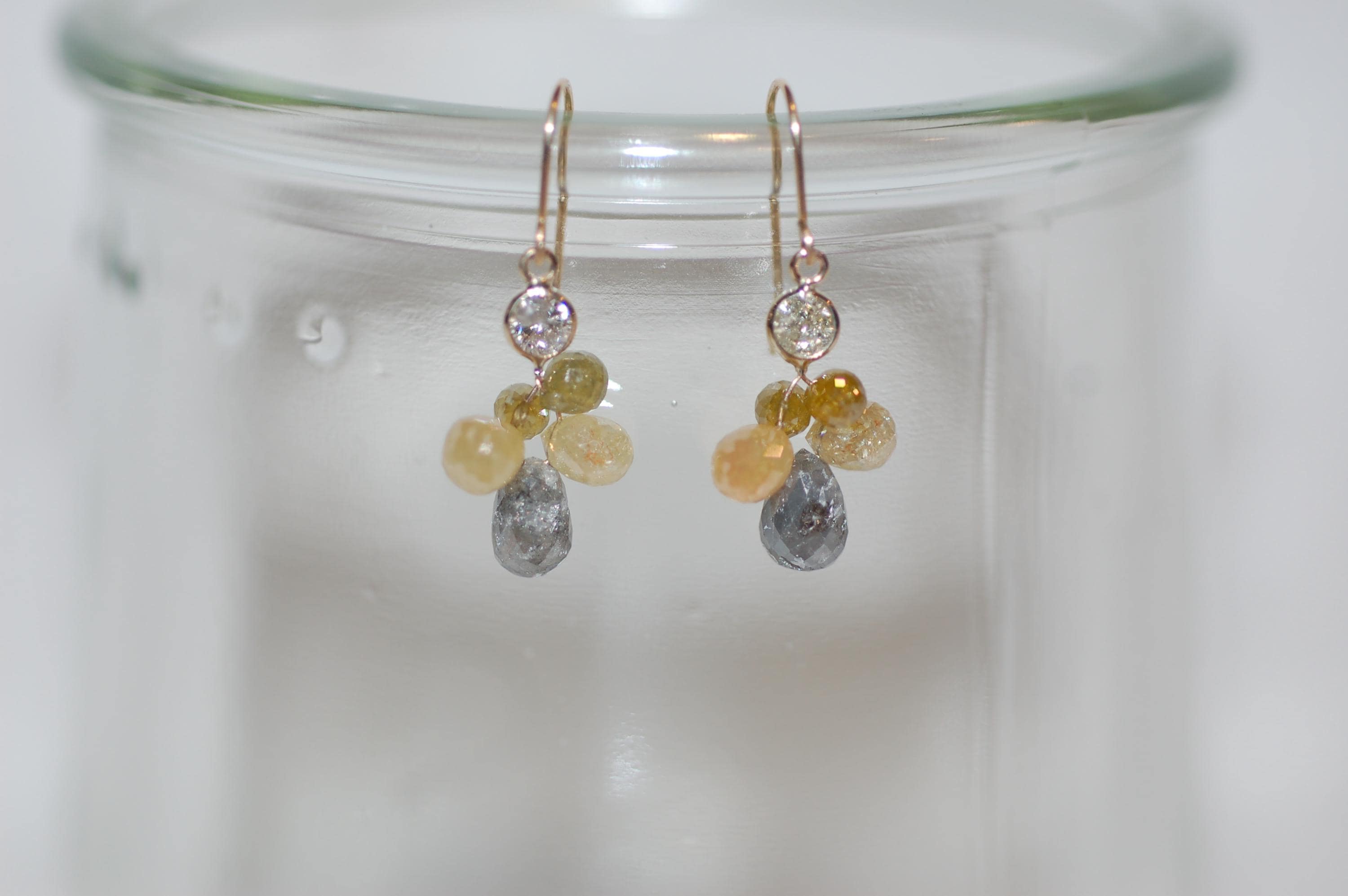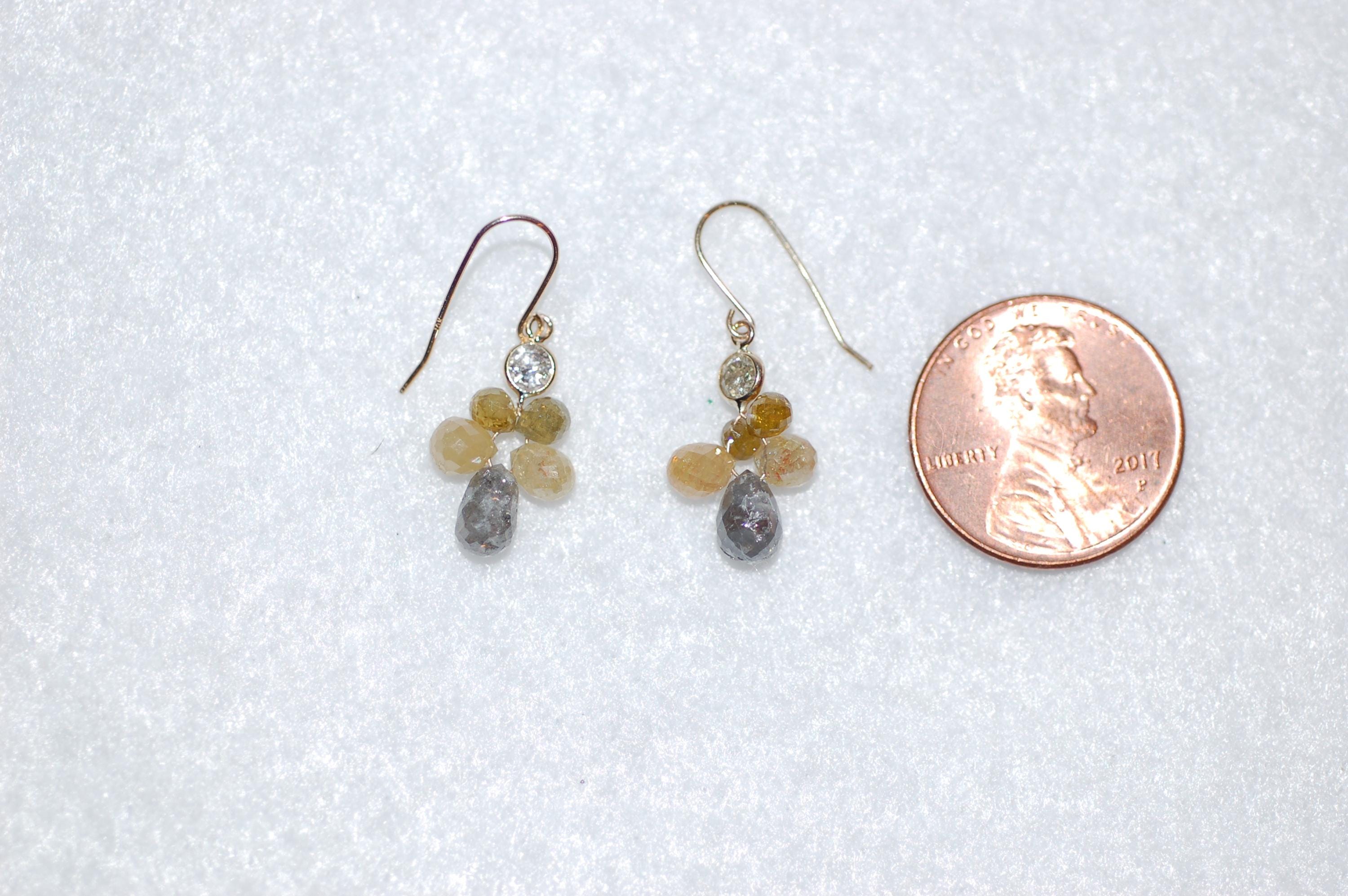 Each earring showcases five faceted briolette diamonds with a large gray diamond drop adding a touch of unique charm. Complemented by a .29 carats total weight of white round lab-grown diamonds, these earrings radiate brilliance and refined style. The 10K yellow gold ear wires lend warmth and durability, making them comfortable for all-day wear.
