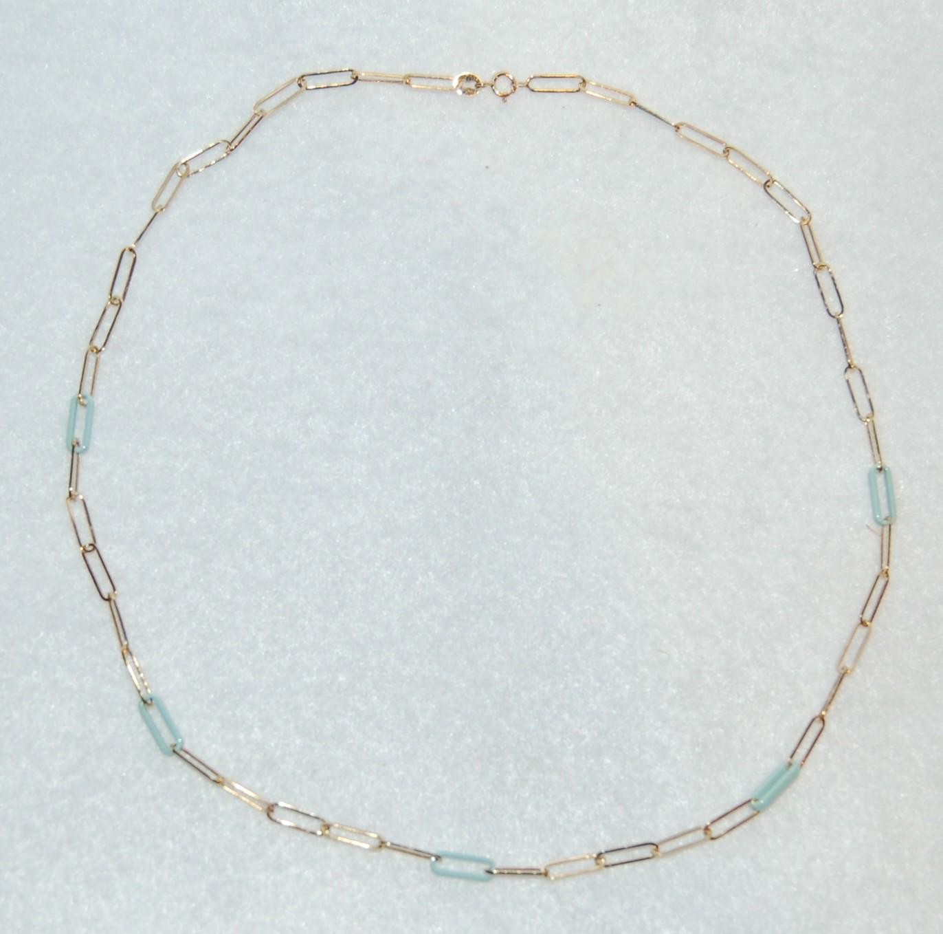 Elevate your everyday style with this stunning 10K Yellow Gold and Resin Geometric Link Necklace. Crafted with a delicate balance of fine jewelry craftsmanship and modern design, this 18-inch chain features a harmonious mix of sleek gold links and light mint resin accents that add a subtle pop of color. Weighing just 2.3 grams, it offers a dainty, lightweight feel perfect for daily wear or layering with other necklaces.
