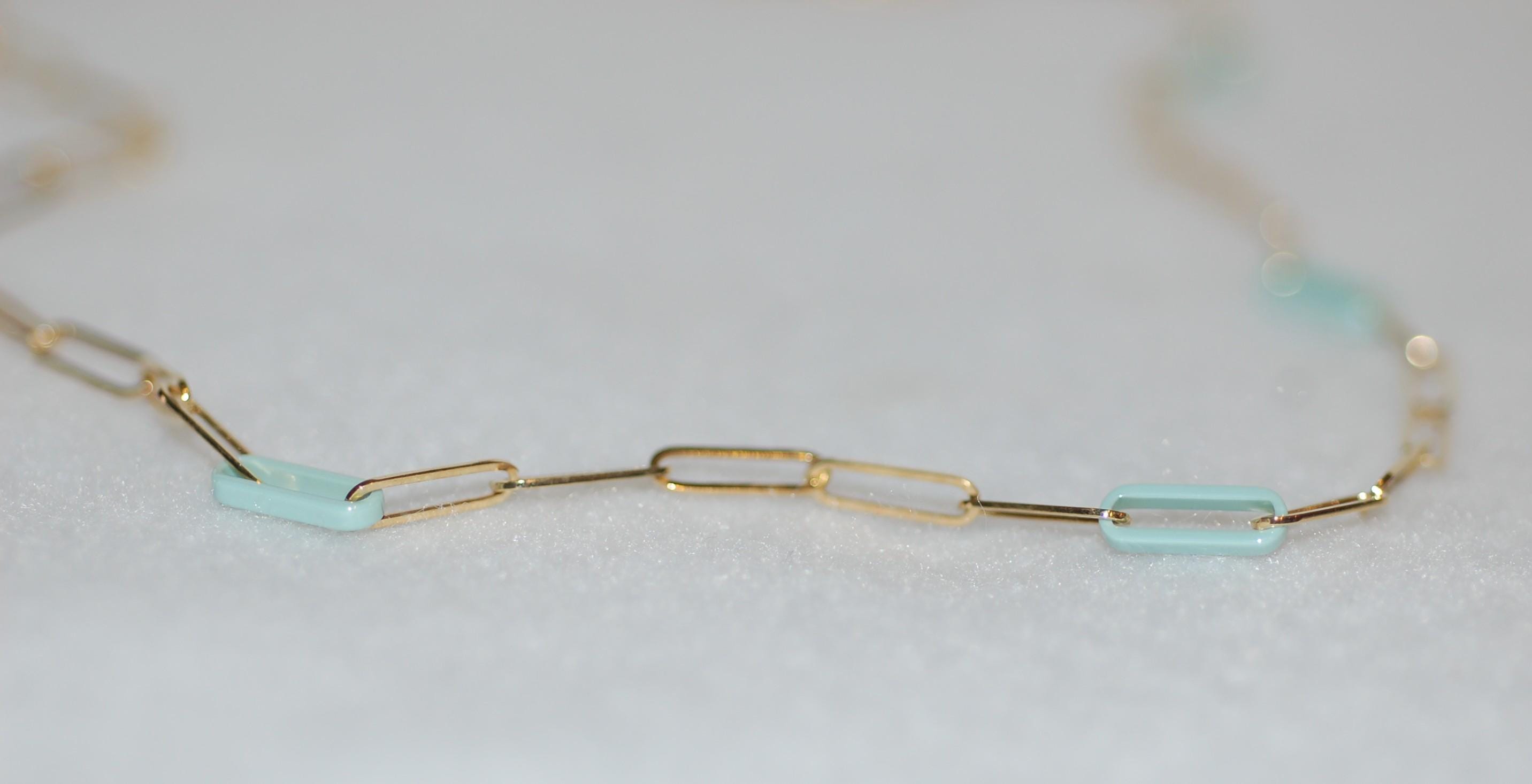 - Material: 10K yellow gold links with light mint resin accents