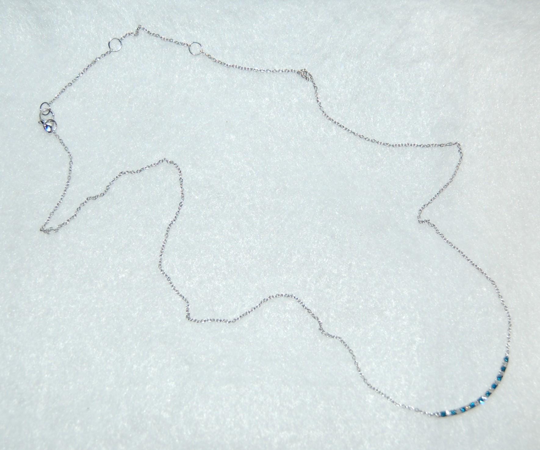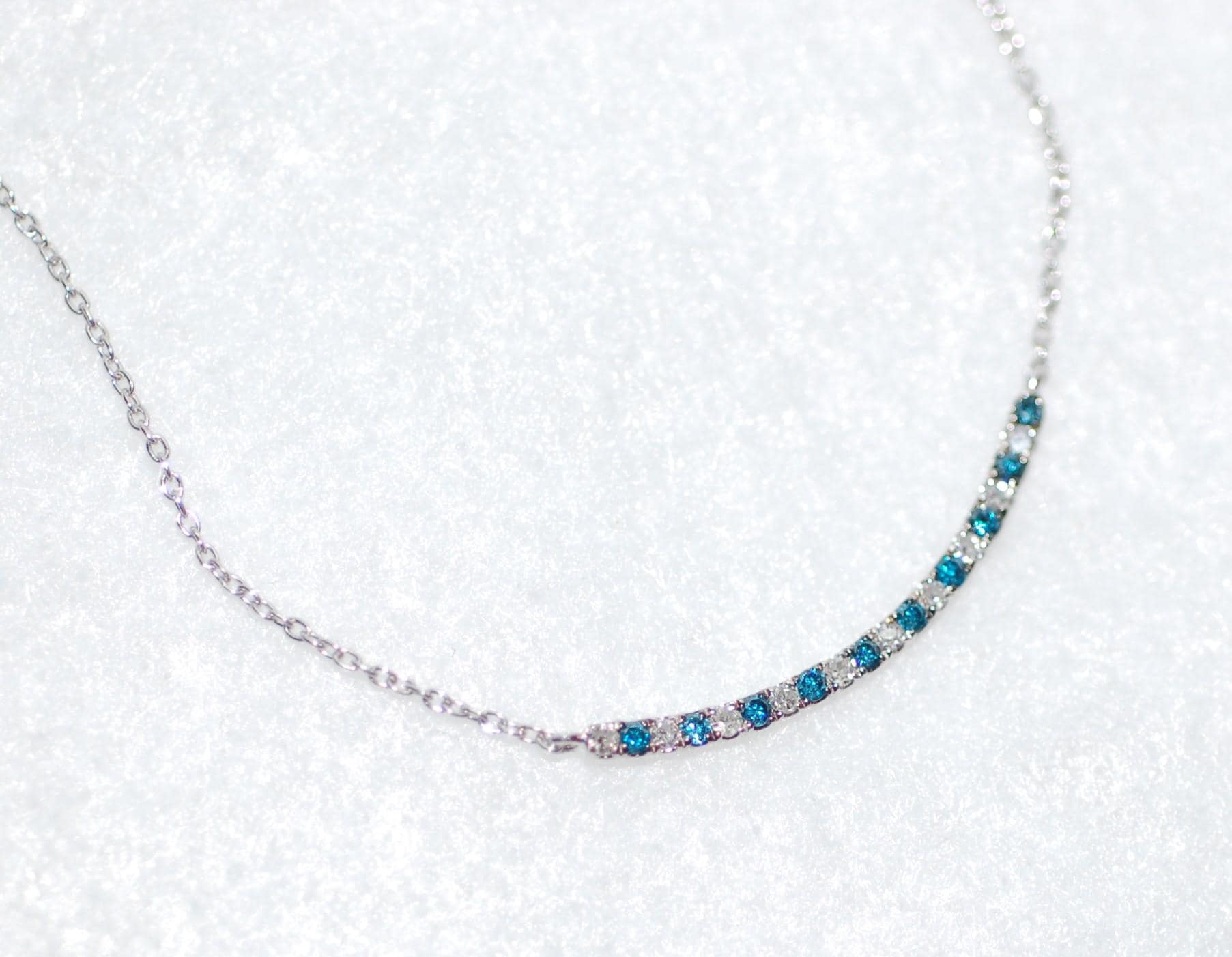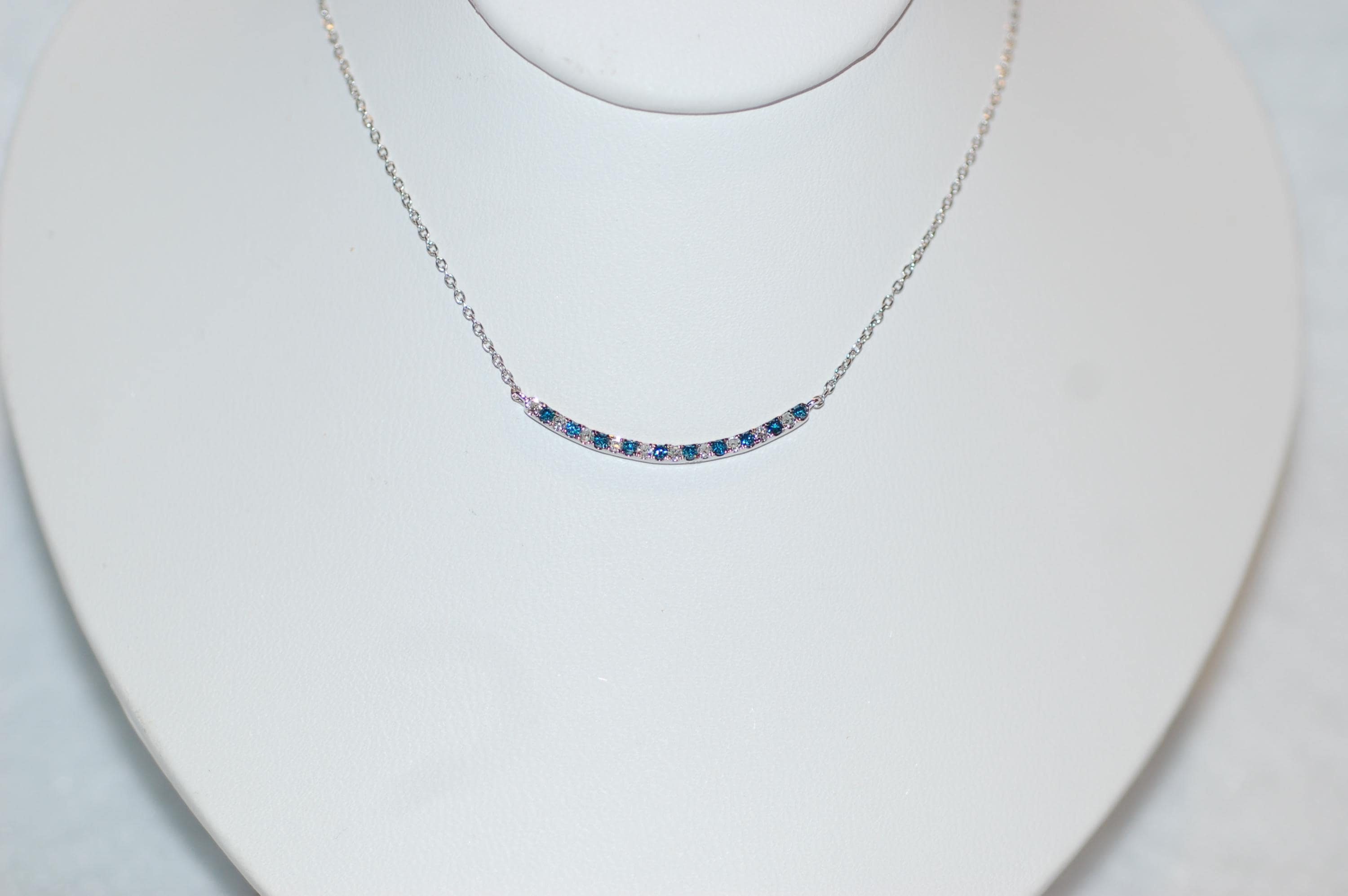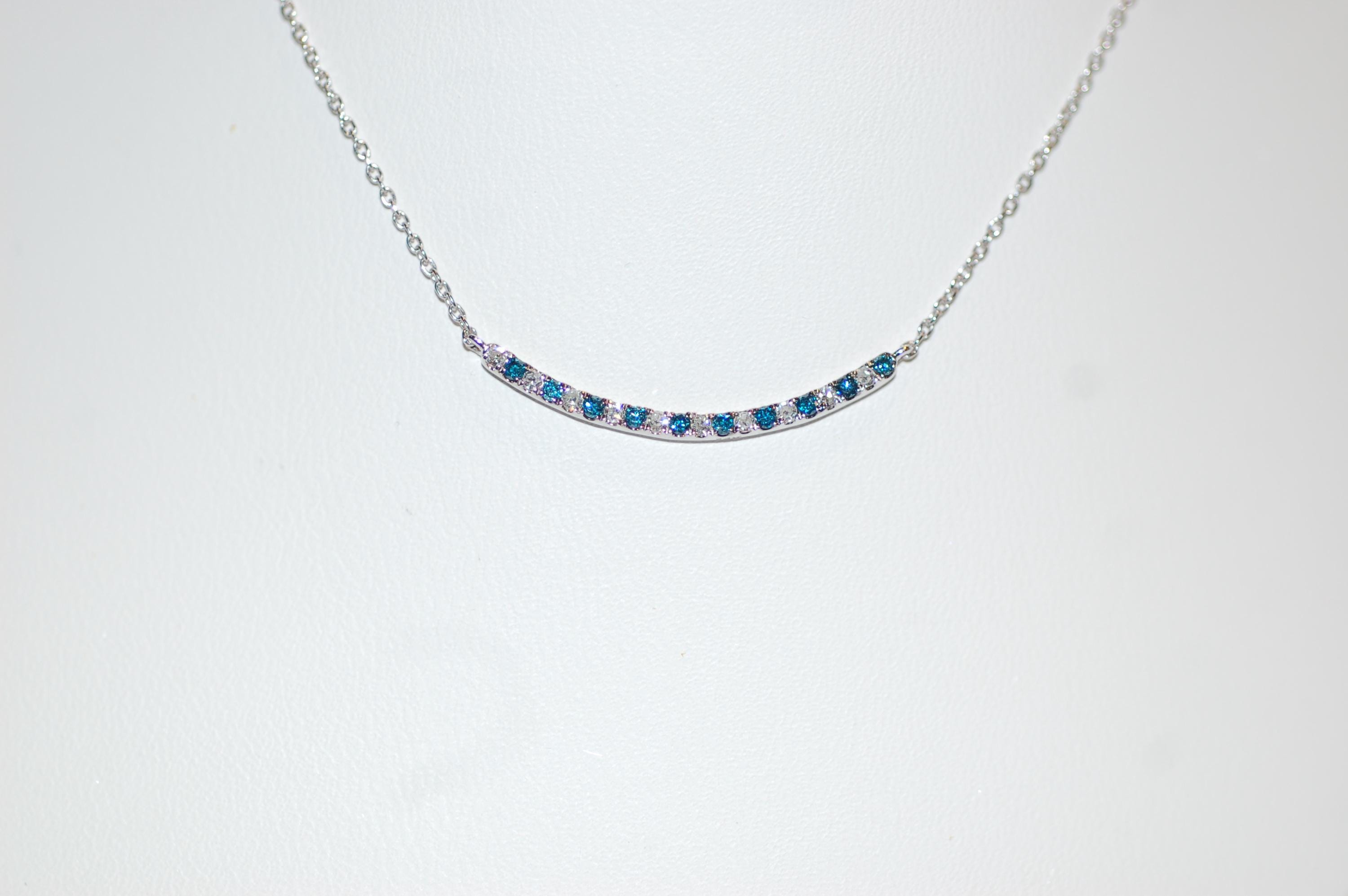 Discover elegance and sparkle with our White and Fancy Teal Diamonds Adjustable Bar Necklace, crafted in 14K white gold. This stunning piece features a delicate bar adorned with a dazzling array of white and teal diamonds, totaling approximately 0.19 carats of brilliant, eye-catching stones. The vibrant teal diamonds add a pop of color and sophistication, making this necklace perfect for elevating any outfit.