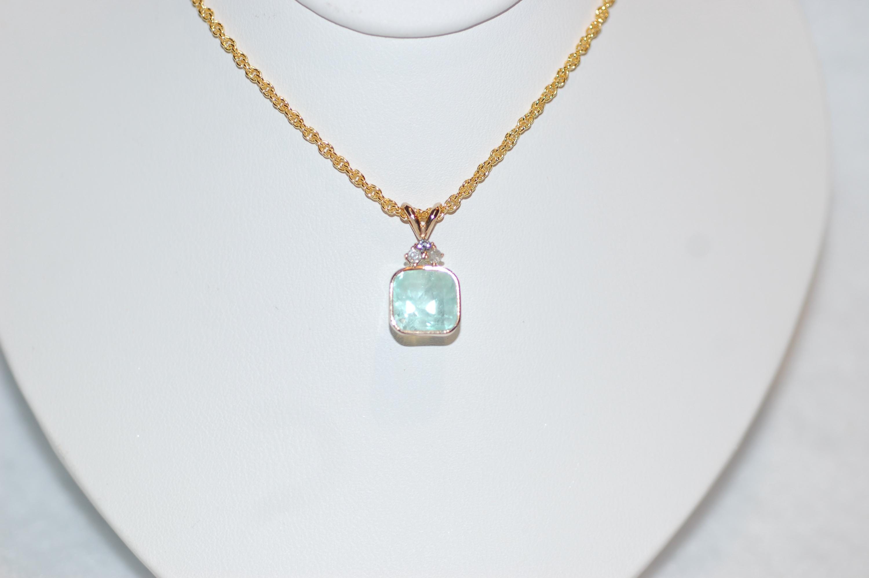 Discover the elegance of this Emerald and Diamond Princess Pendant, crafted in radiant 14K yellow gold. Featuring a stunning square-cut light green emerald weighing approximately 3.1 carats, this pendant exudes timeless beauty and sophistication. Accentuated by three sparkling diamonds totaling 0.03 carats, the pendant offers a delicate touch of brilliance that elevates its luxurious appeal.